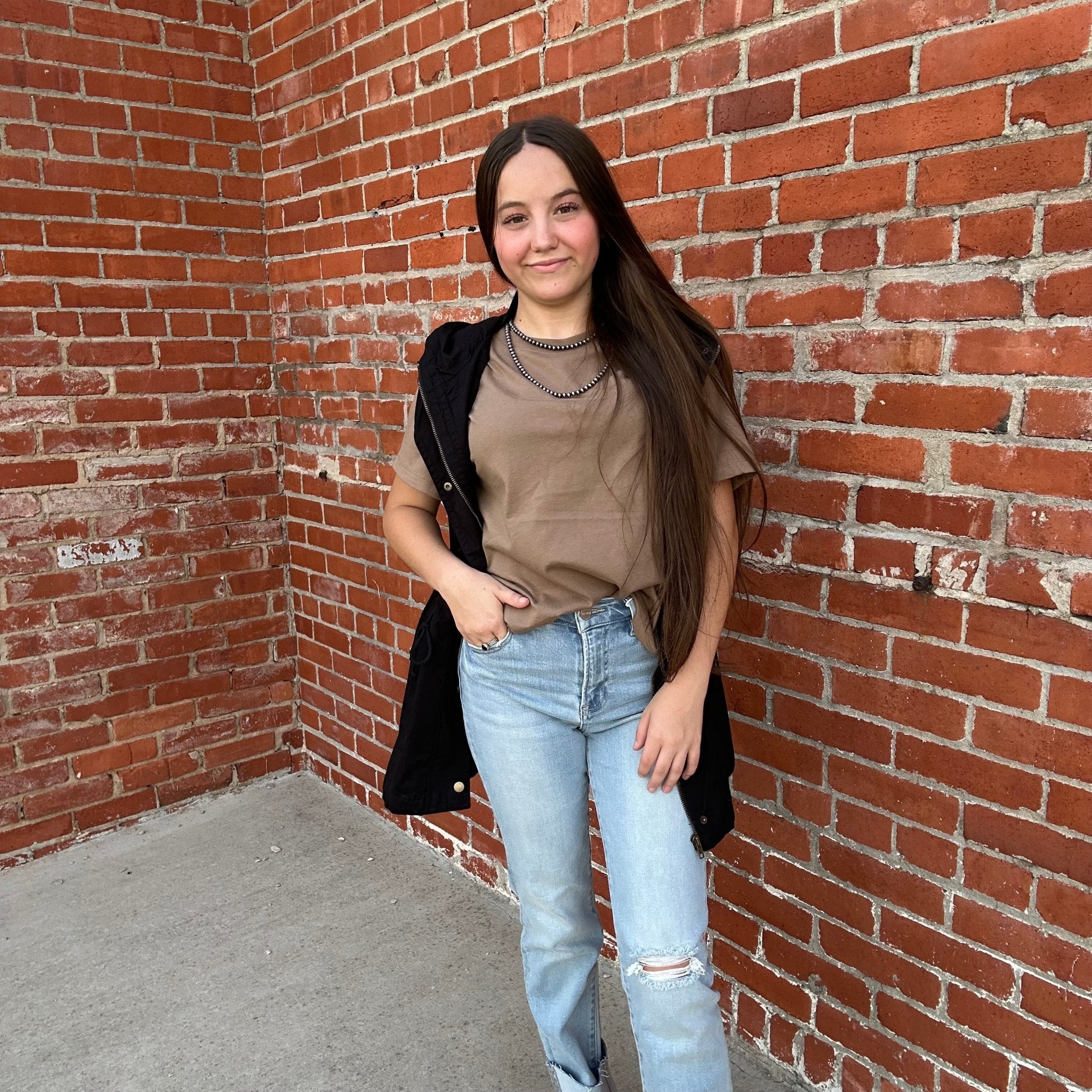 This vest is gonna be your go to for this fall. I love all the zippers and fun details on a cargo vest and this one does not disappoint. Kaylee is wearing the small and has a thin undershirt on so it fits perfect. If you plan on wearing it with bulky sweaters this winter, I would go ahead and get your normal size 100% cotton fabric is going to last so long.