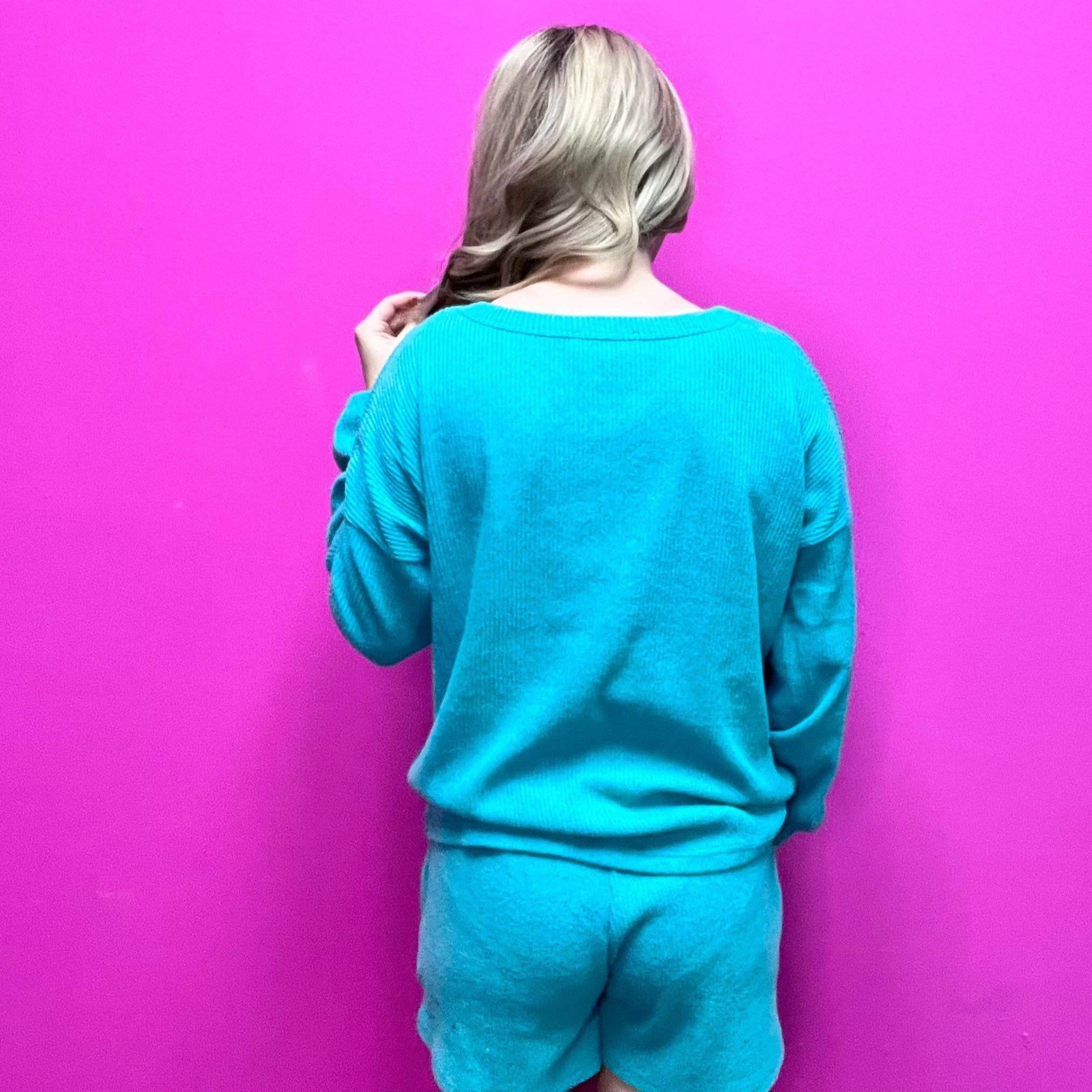 Turquoise Comfy Set Long Sleeve Top w/ Pockets Shorts size medium