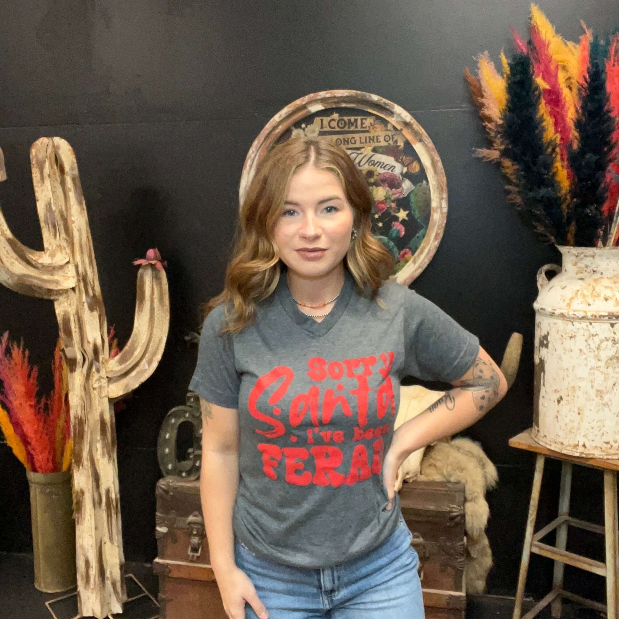 Sorry Santa I've Been Feral Heather Graphite Grey with Red V Neck T-shirt
