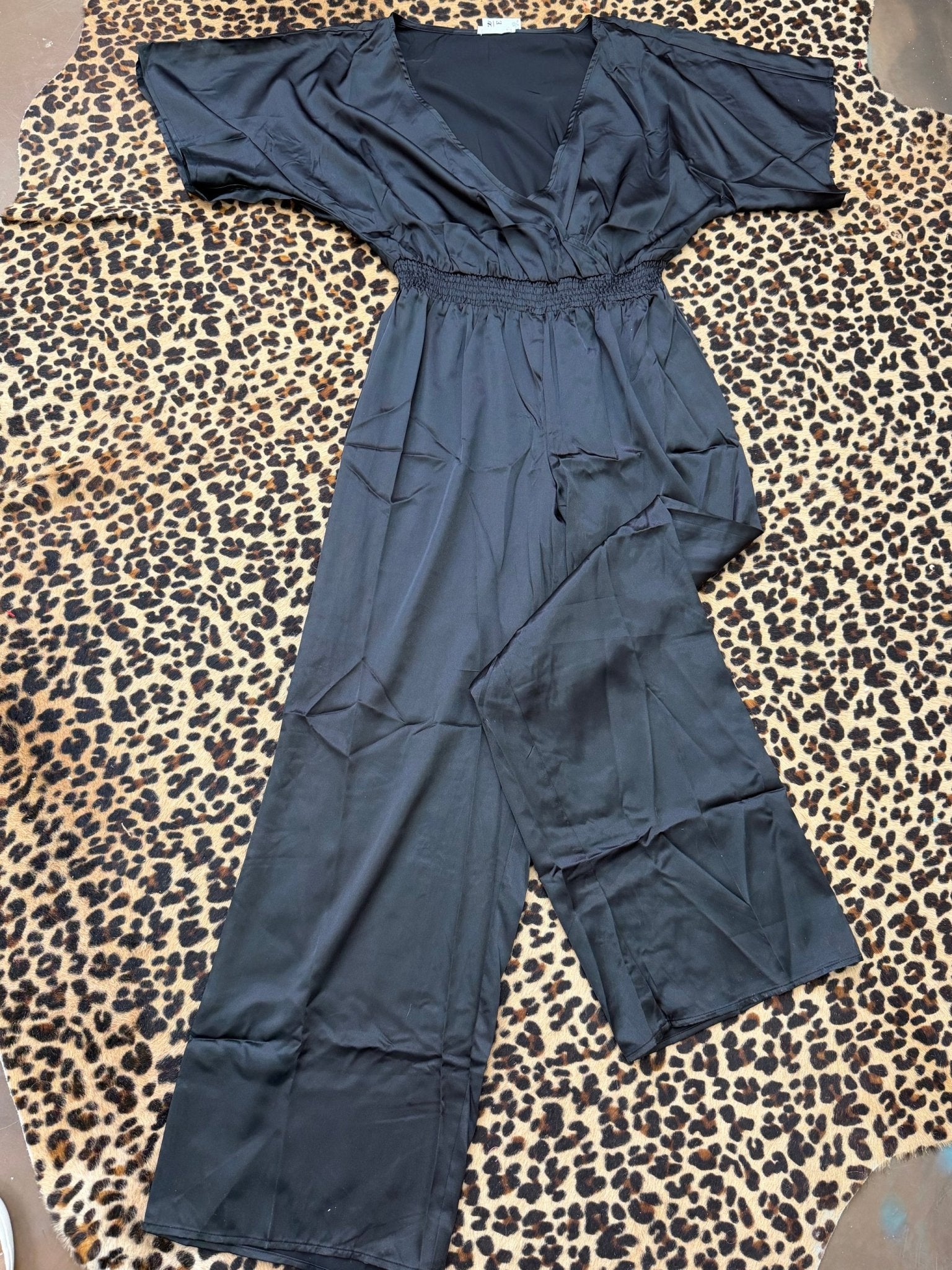 Black Satin Short Sleeve Romper Jumpsuit w/ Smocked Waist