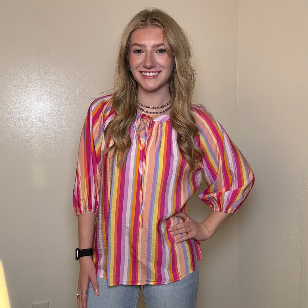 The Bright Stripe 3/4 Length Sleeve Top is the perfect choice for those who want to make a statement. Featuring a blend of colors, this colorful top offers an exciting way to brighten your wardrobe. The stripes are artfully arranged to add flair while keeping you comfortably in style. Its bold patterns make it ideal for casual outings or weekend adventures.