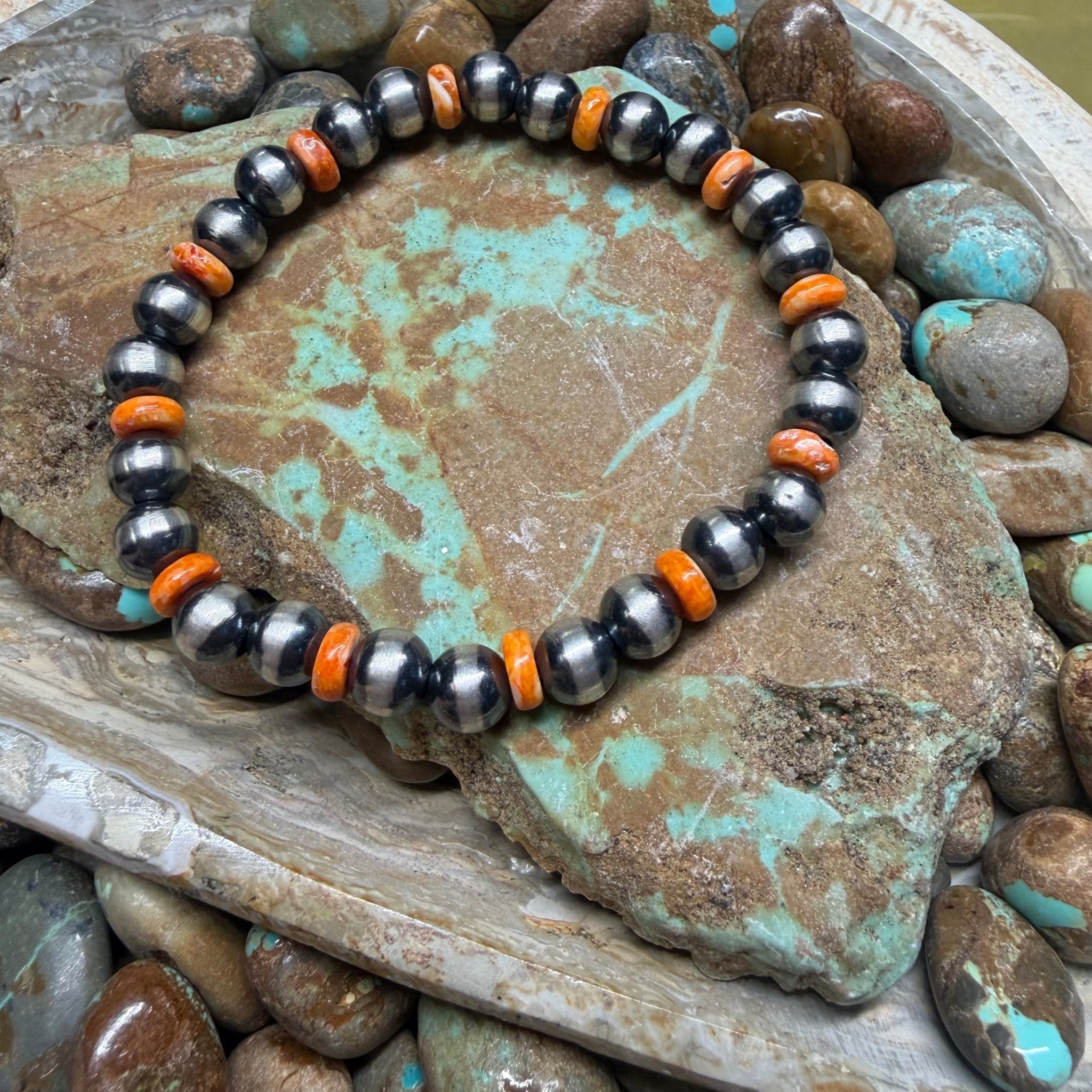 Orange Spiny Stretchy 6mm Pearl Sterling Silver Bracelet