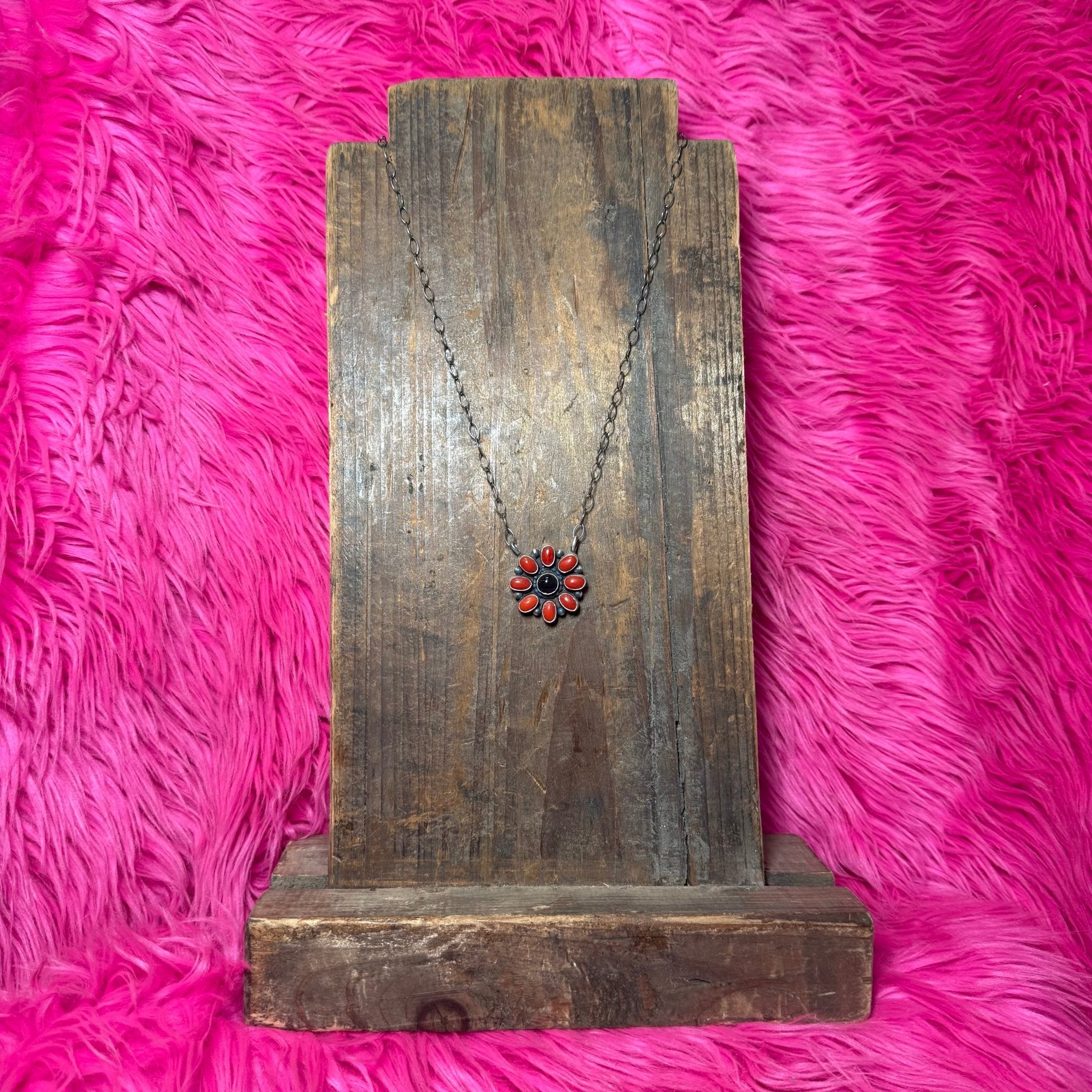 Red Coral Cluster with a Black Onyx Center Sterling Silver Necklace