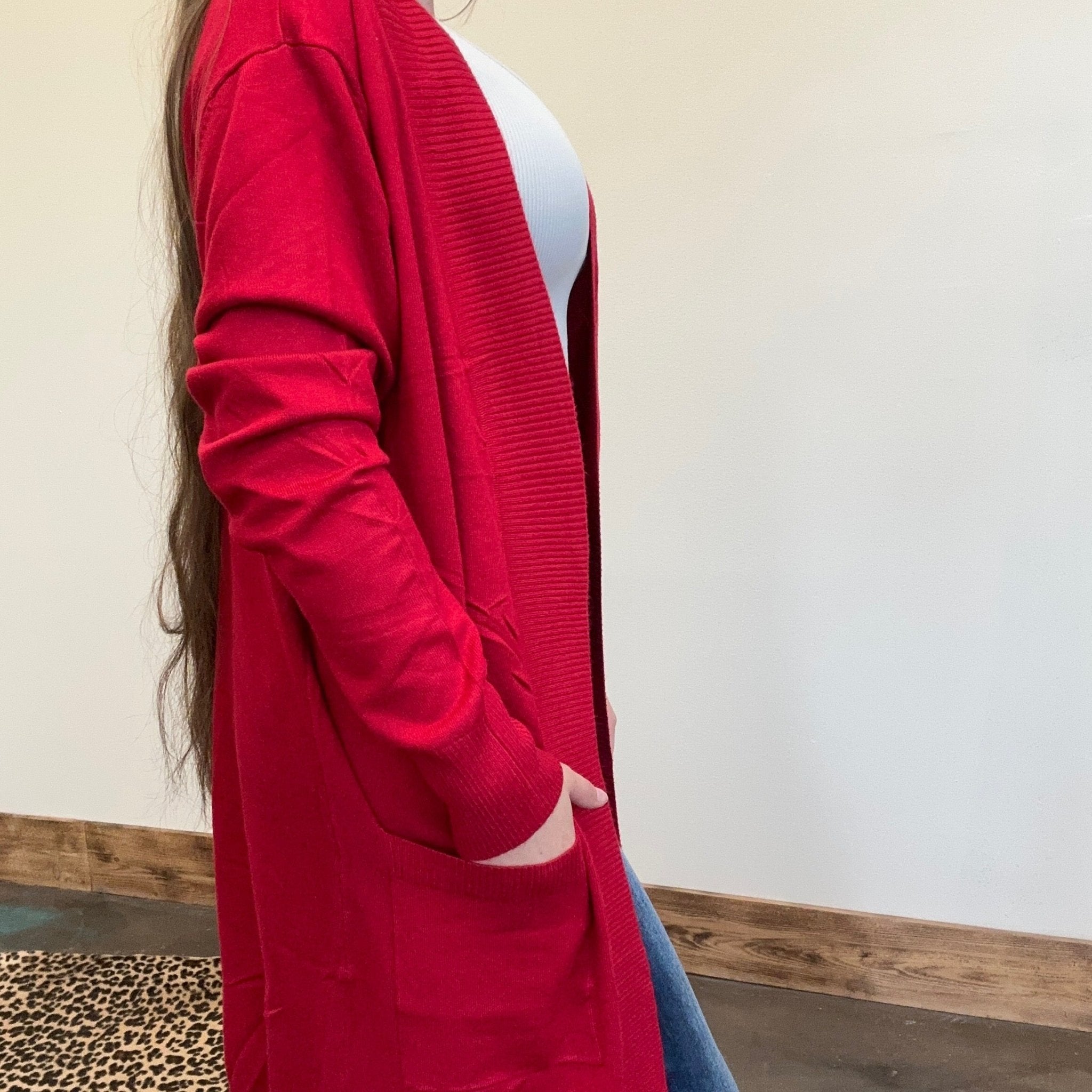 Red Open Front w/ Pockets Long Sleeve Cardigan