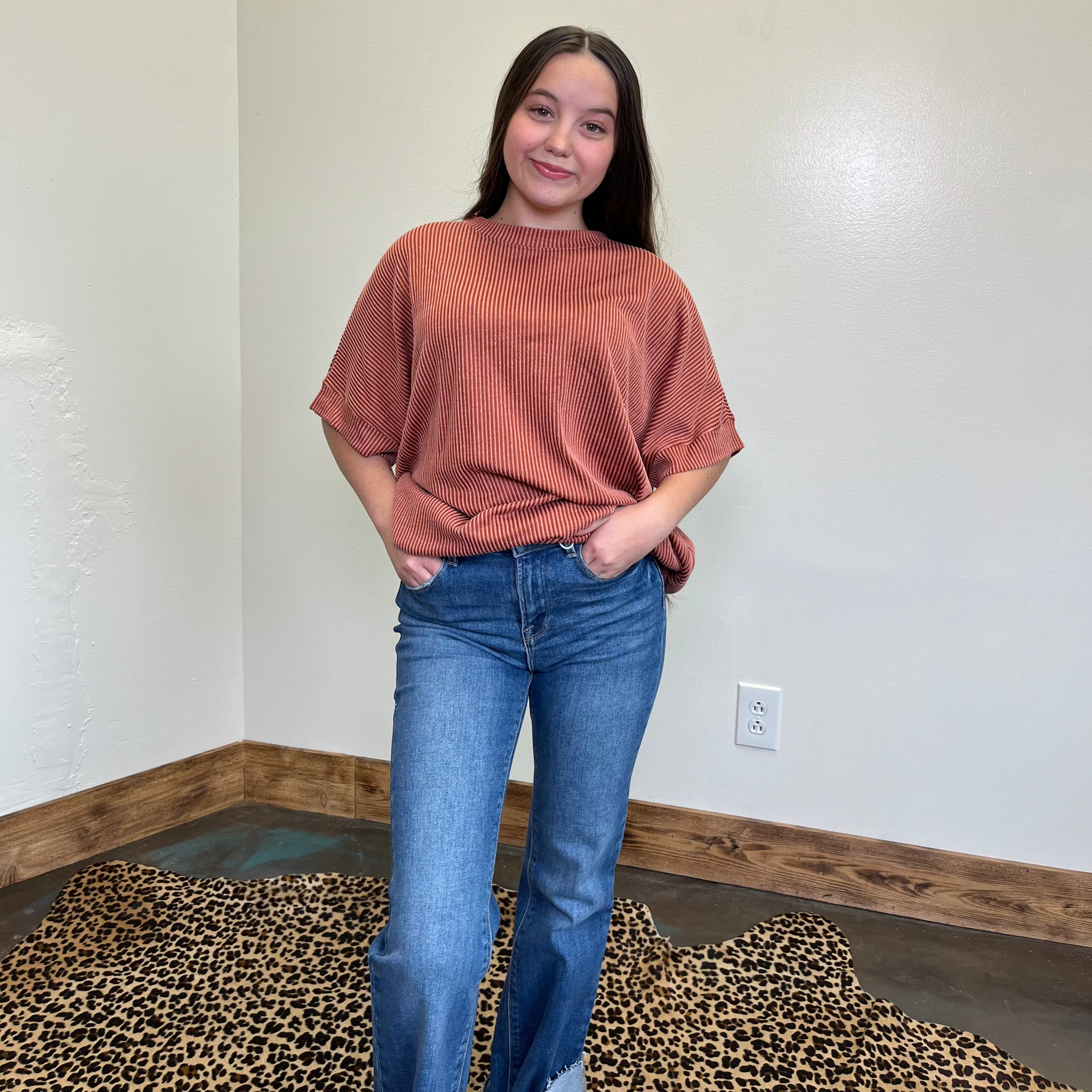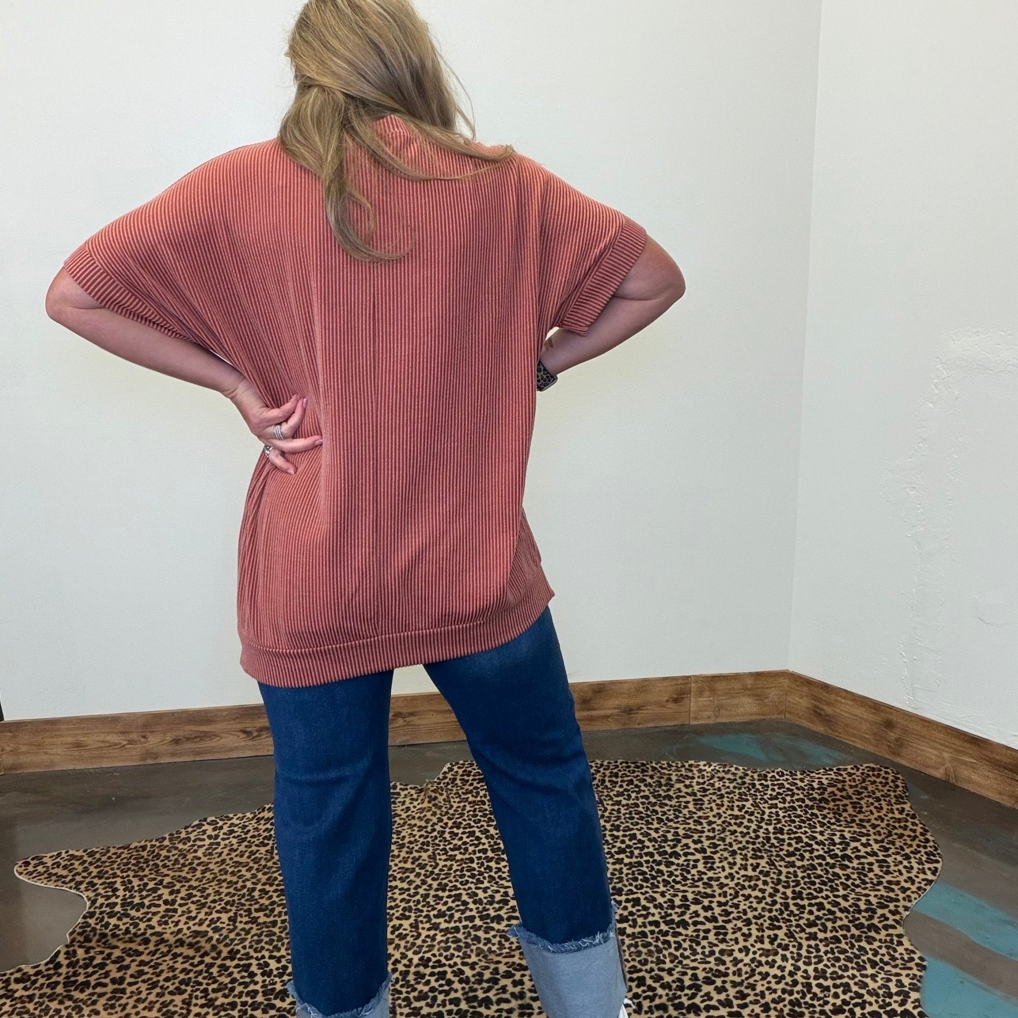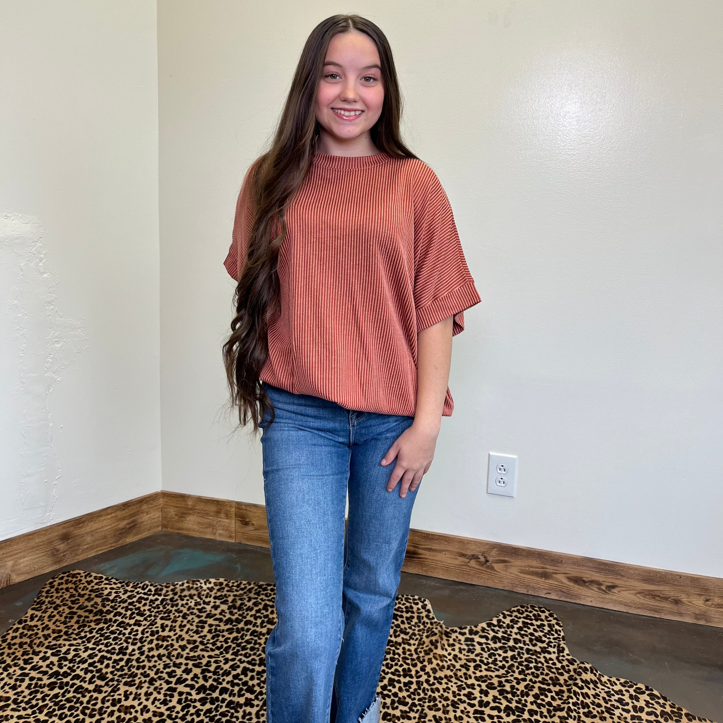 Rust Orange Ribbed Oversized Round Neck Short Sleeve Shirt