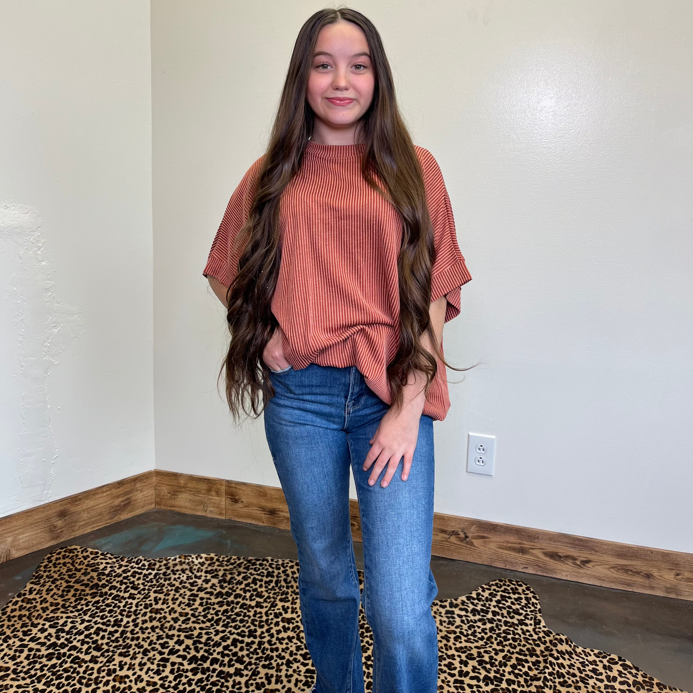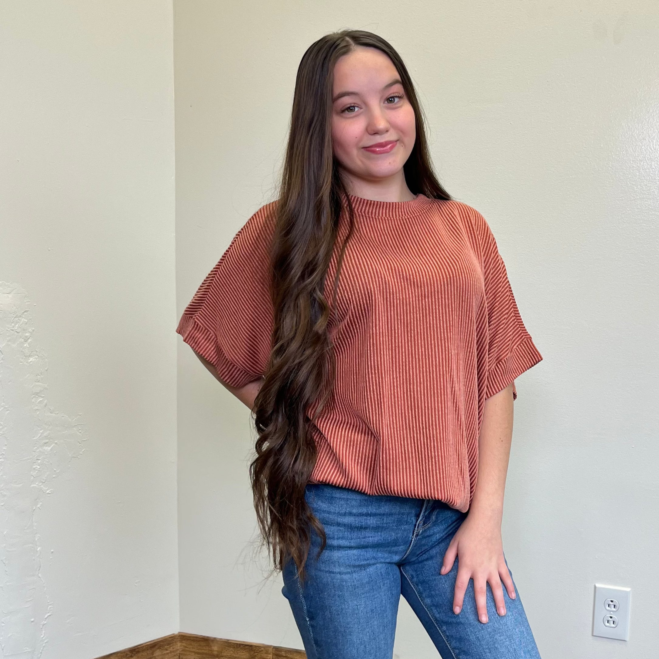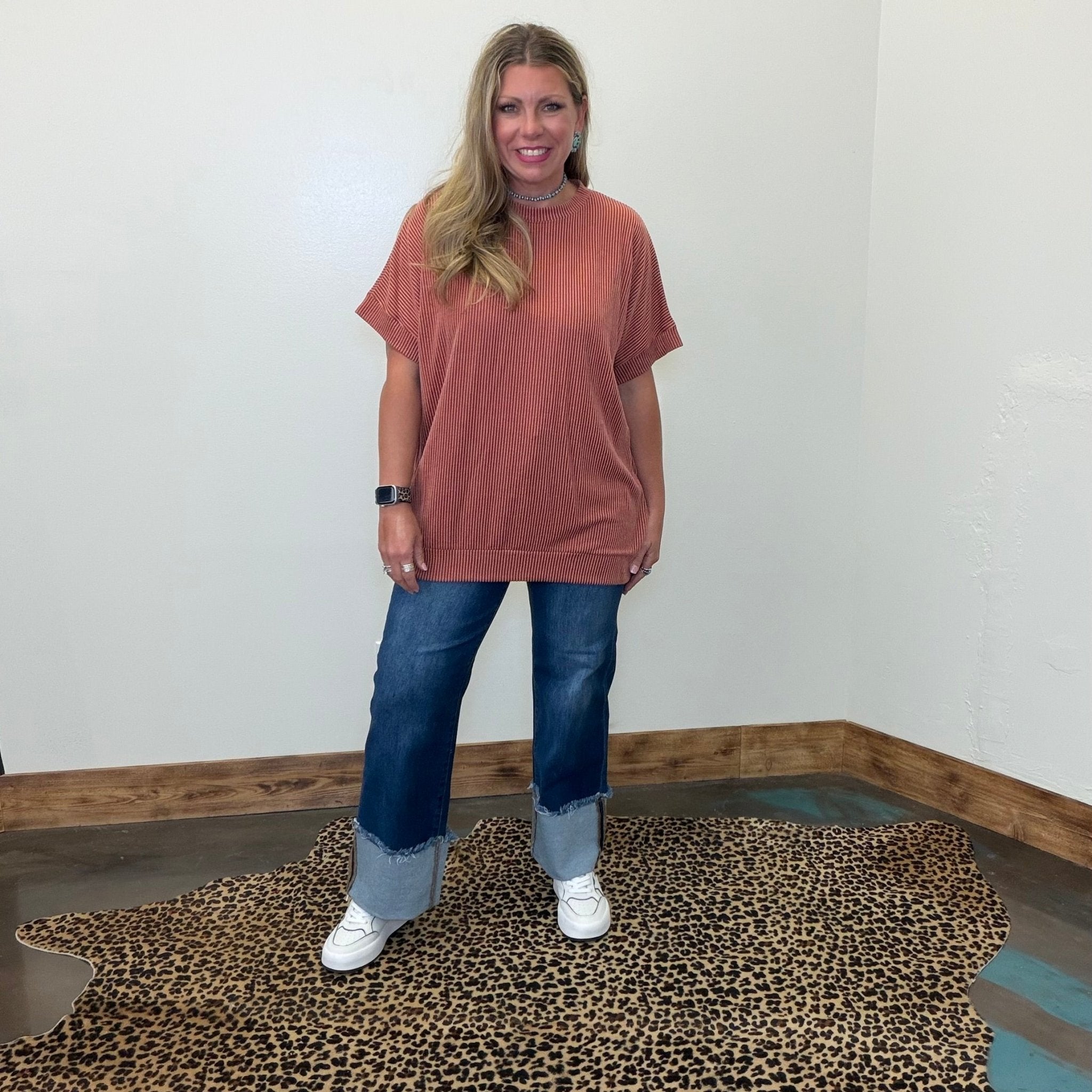 Rust Orange Ribbed Oversized Round Neck Short Sleeve Shirt