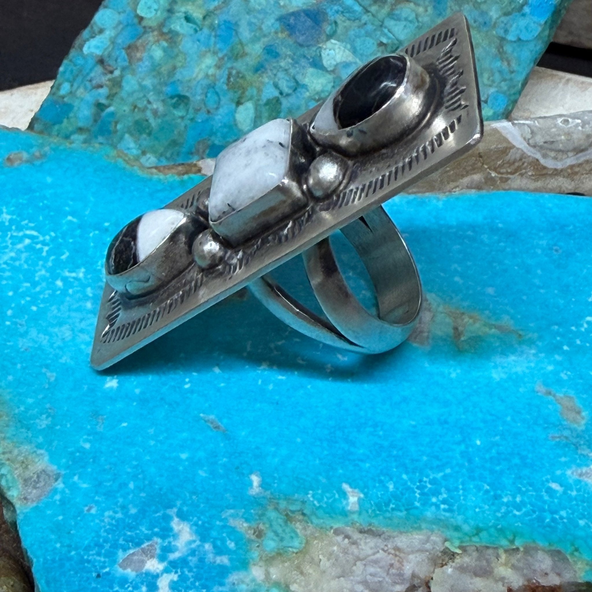 Gorgeous 3 Stone White Buffalo Silver Detailed Sterling Silver Ring size 8.5