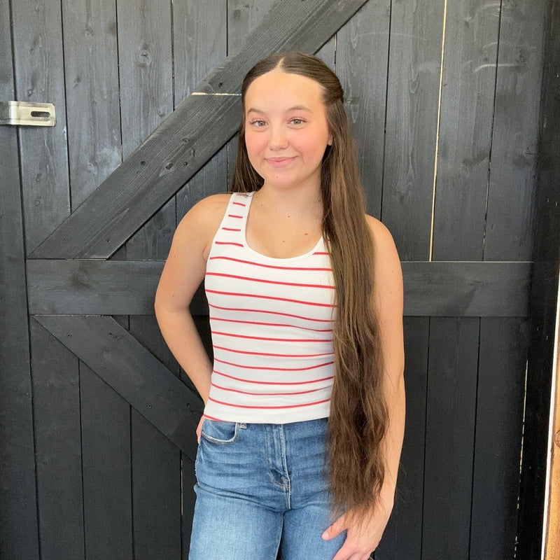 Red & White Striped Ribbed Tank Top with Built in Bra