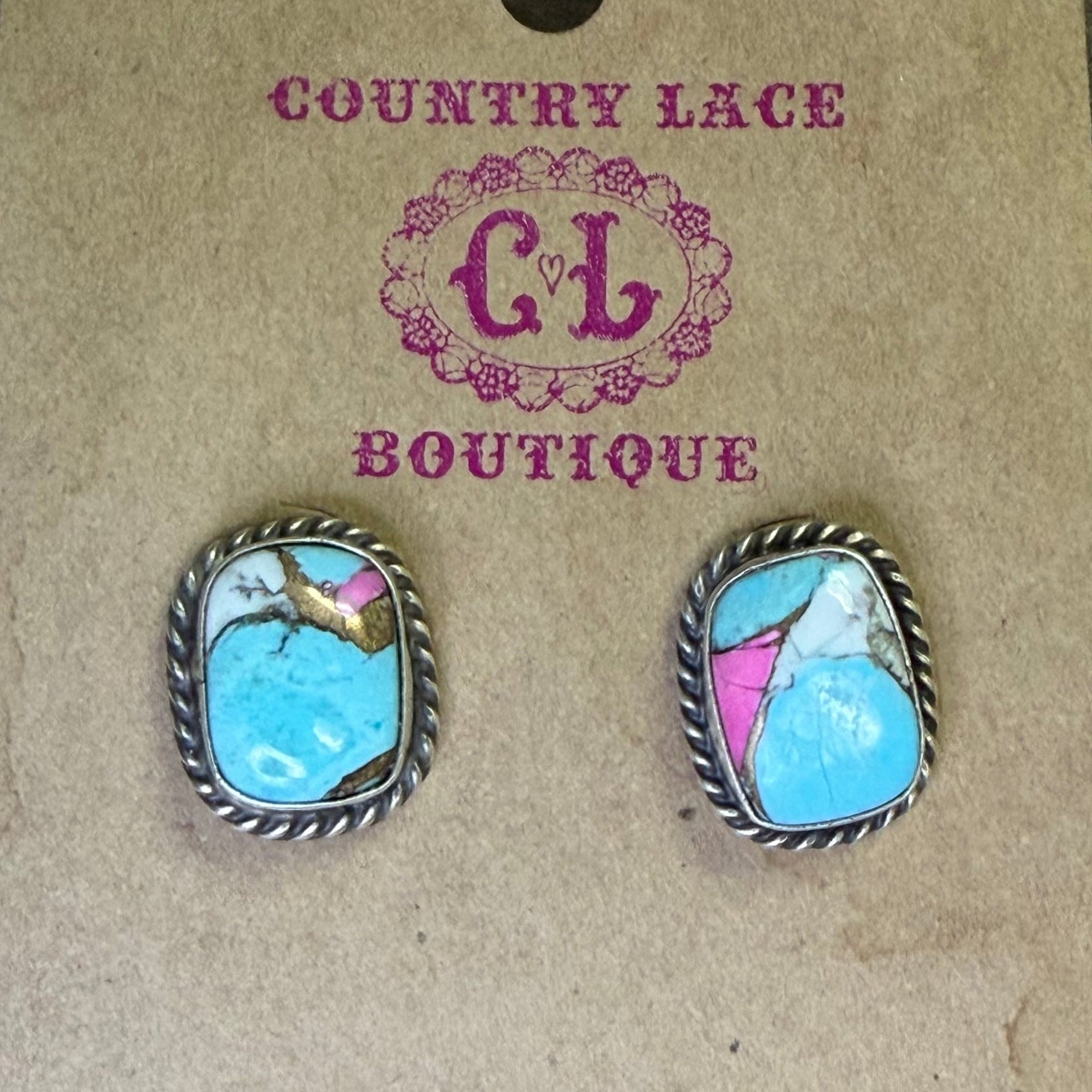 Hold tight, honey — these Oval Cotton Candy Turquoise Rope Detail Post Earrings are sugary-sweet with a whole lotta Southwestern sass. Crafted in genuine sterling silver, each pair glows like sunrise on fresh desert sand. The oval silhouette gives you that soft, dreamy “cotton candy” vibe, while the hand-worked rope detailing adds texture, dimension, and that classic Navajo punch we all swoon over.