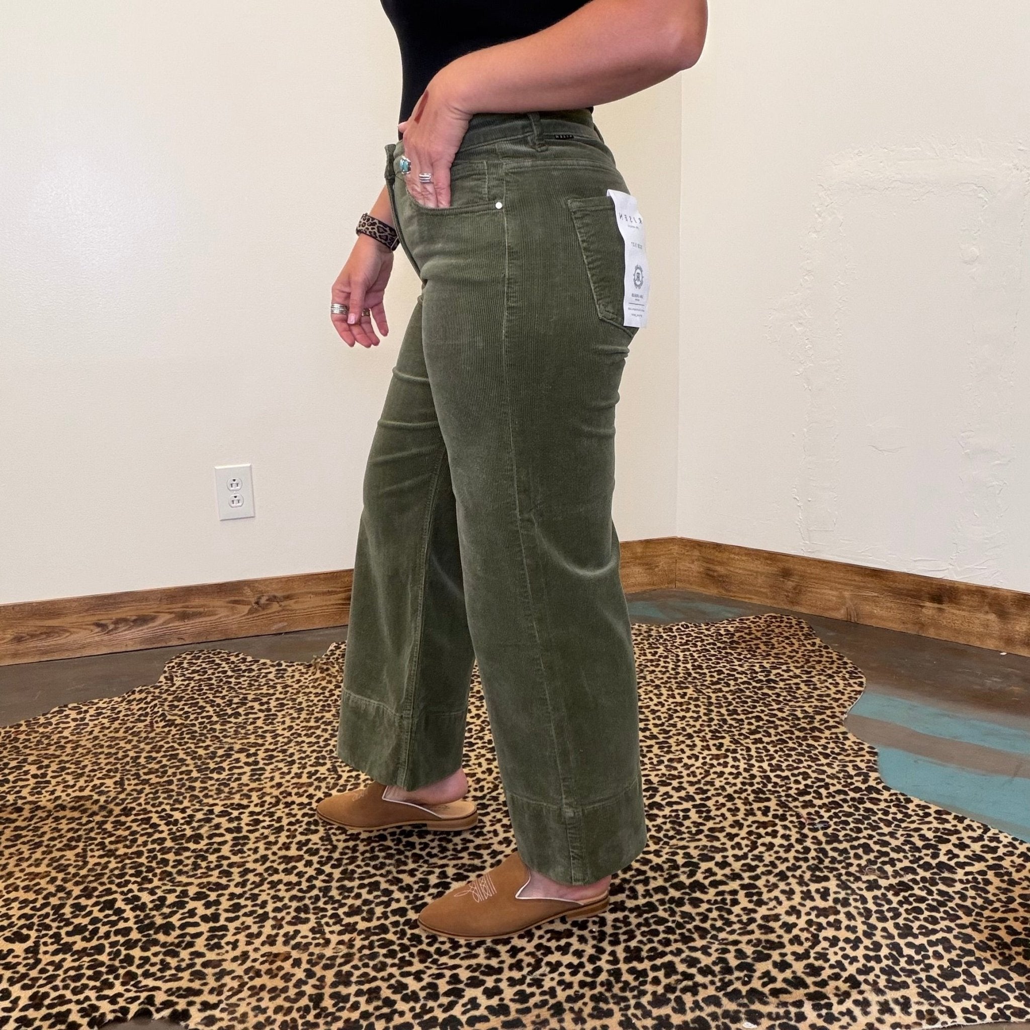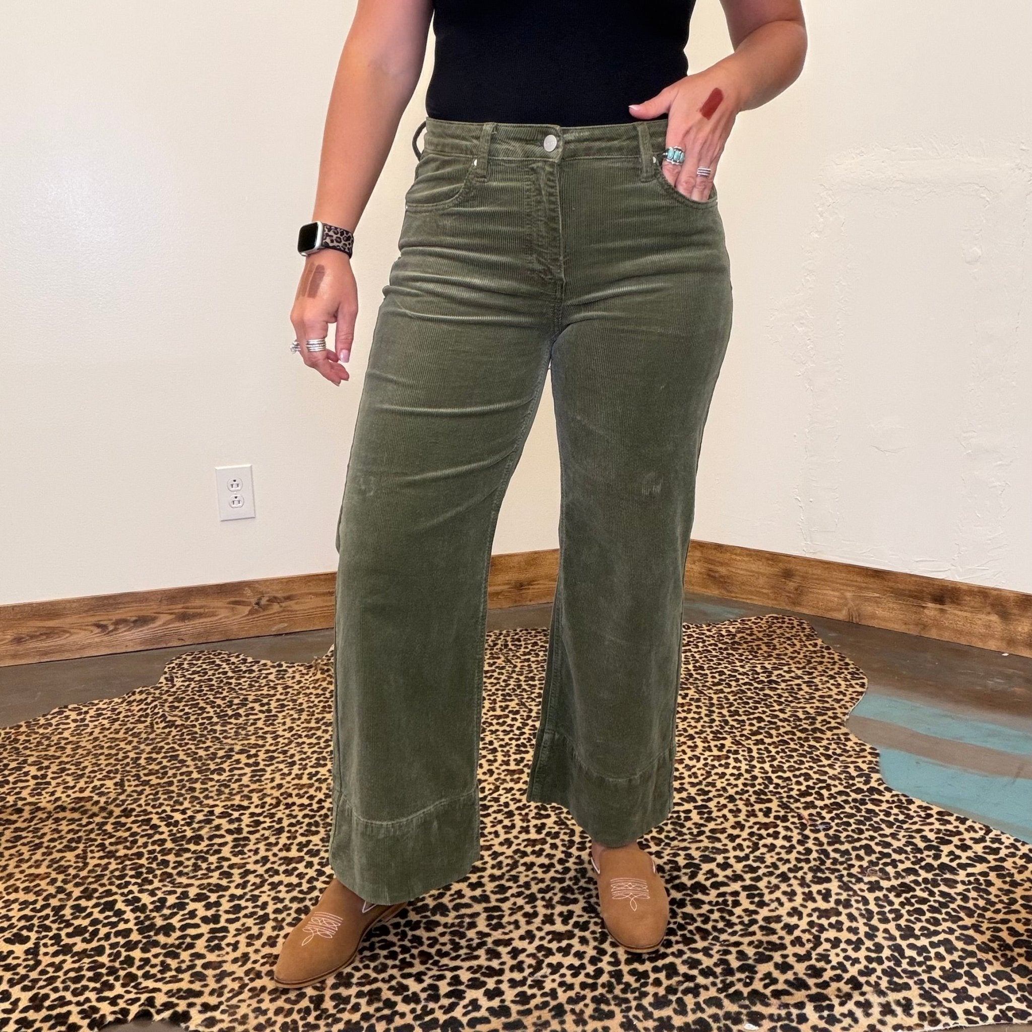 Olive Green Corduroy Risen Crop Tummy Control Jeans