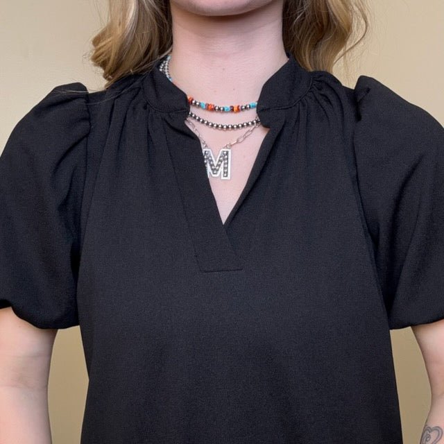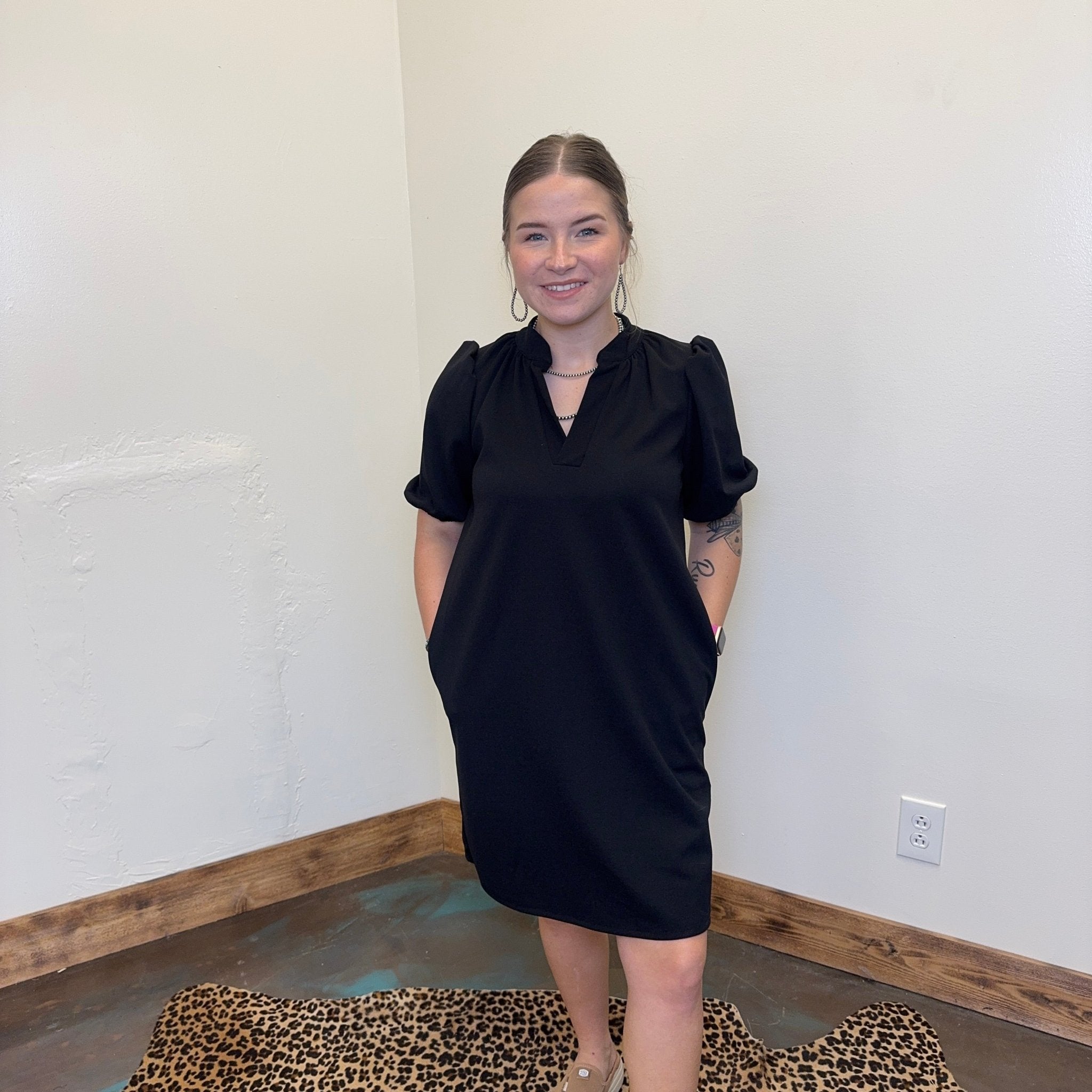 Black Mandarin Collar V Neck Puff Sleeve Short Knee Length Dress w/ Pockets
