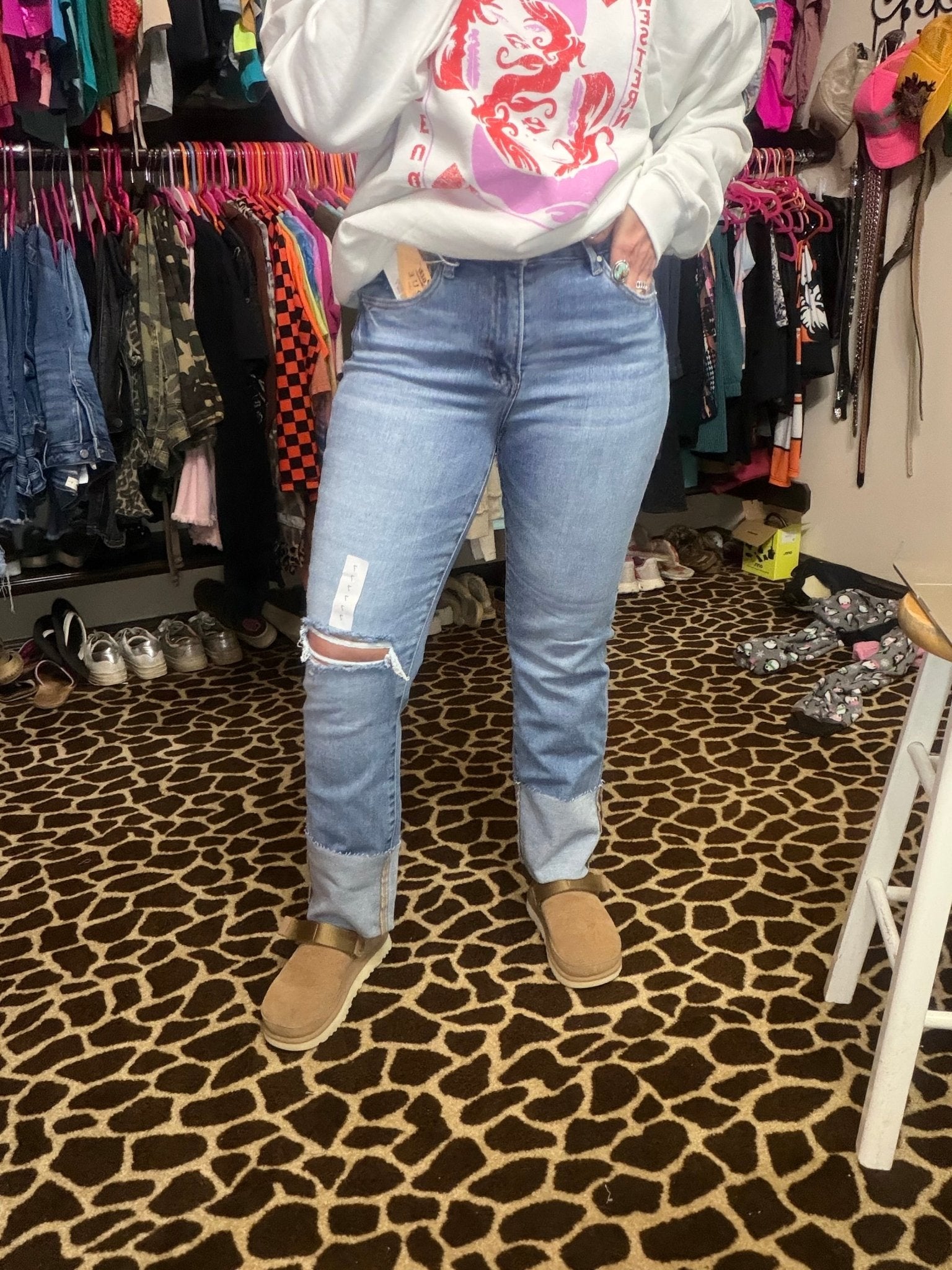 Medium Wash High Rise Distressed Knee Straight-Wide Cuffed Risen Jeans