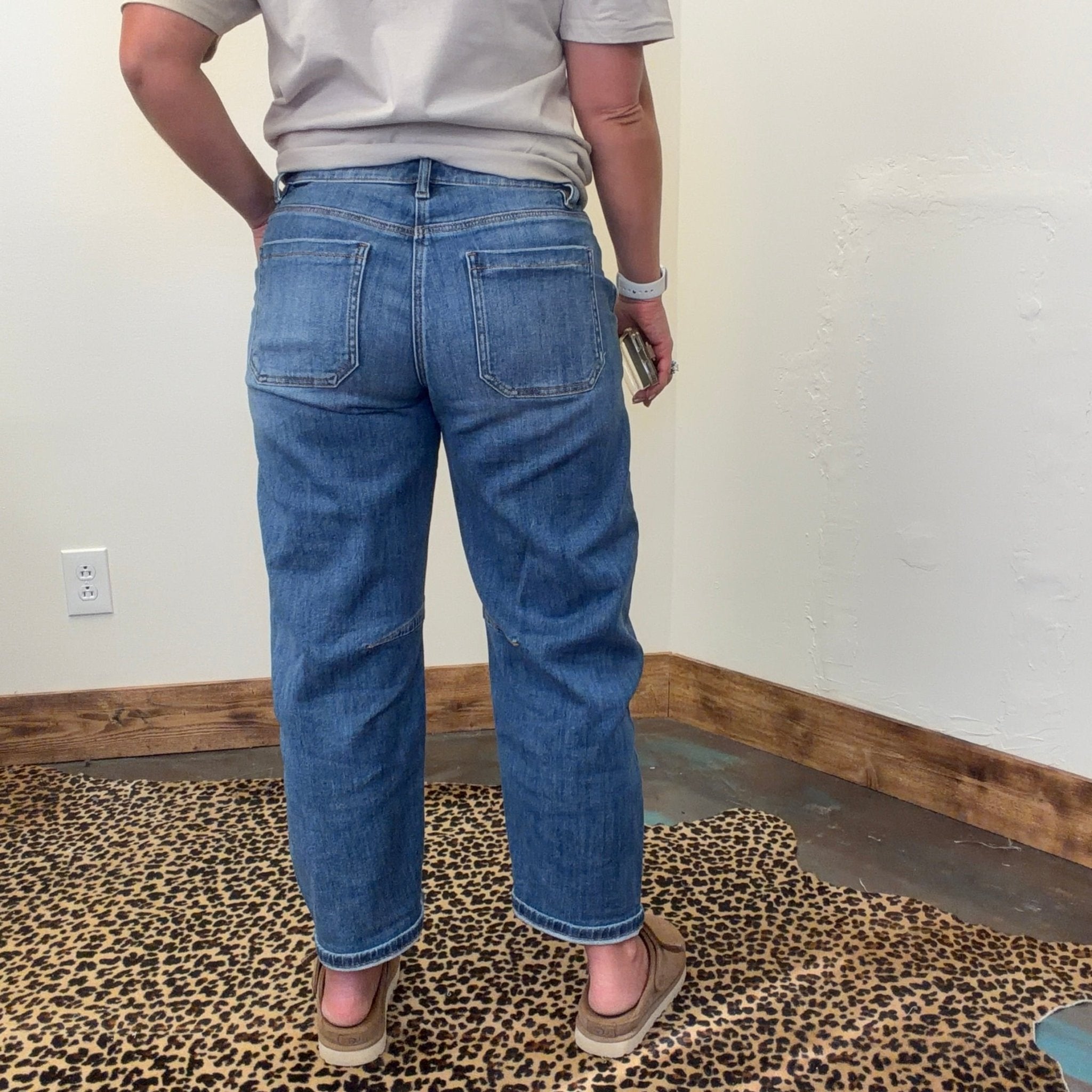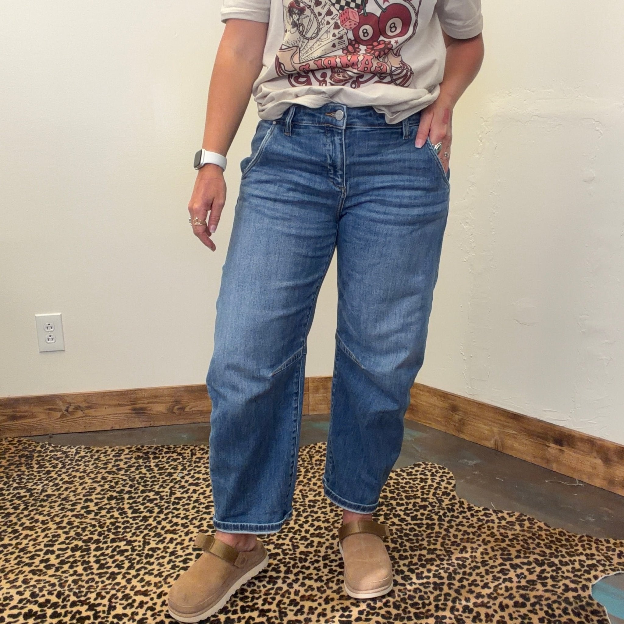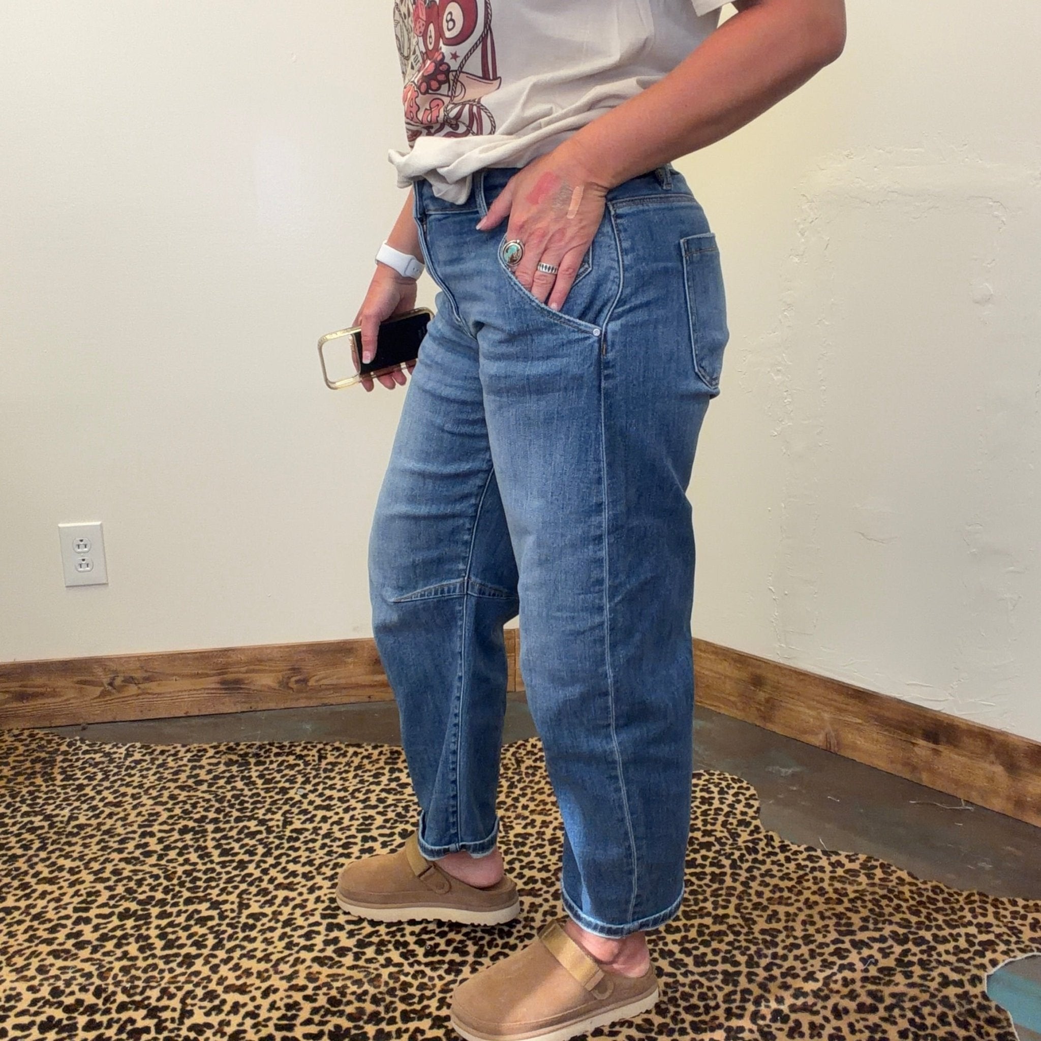Discover the perfect blend of style and comfort with our Medium Wash Slouchy Cropped Barrel Risen Jeans. These jeans feature a trendy barrel fit, providing a roomy, slouchy silhouette that's perfect for laid-back outings or weekend brunch. The medium wash finish offers a timeless look, effortlessly pairing with your favorite tops and sneakers.
