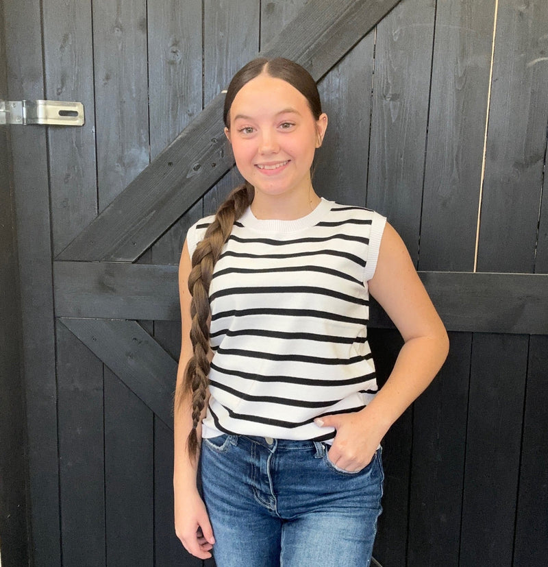 White w/ Black Stripes Simple Crew Neck Sleeveless Vest
