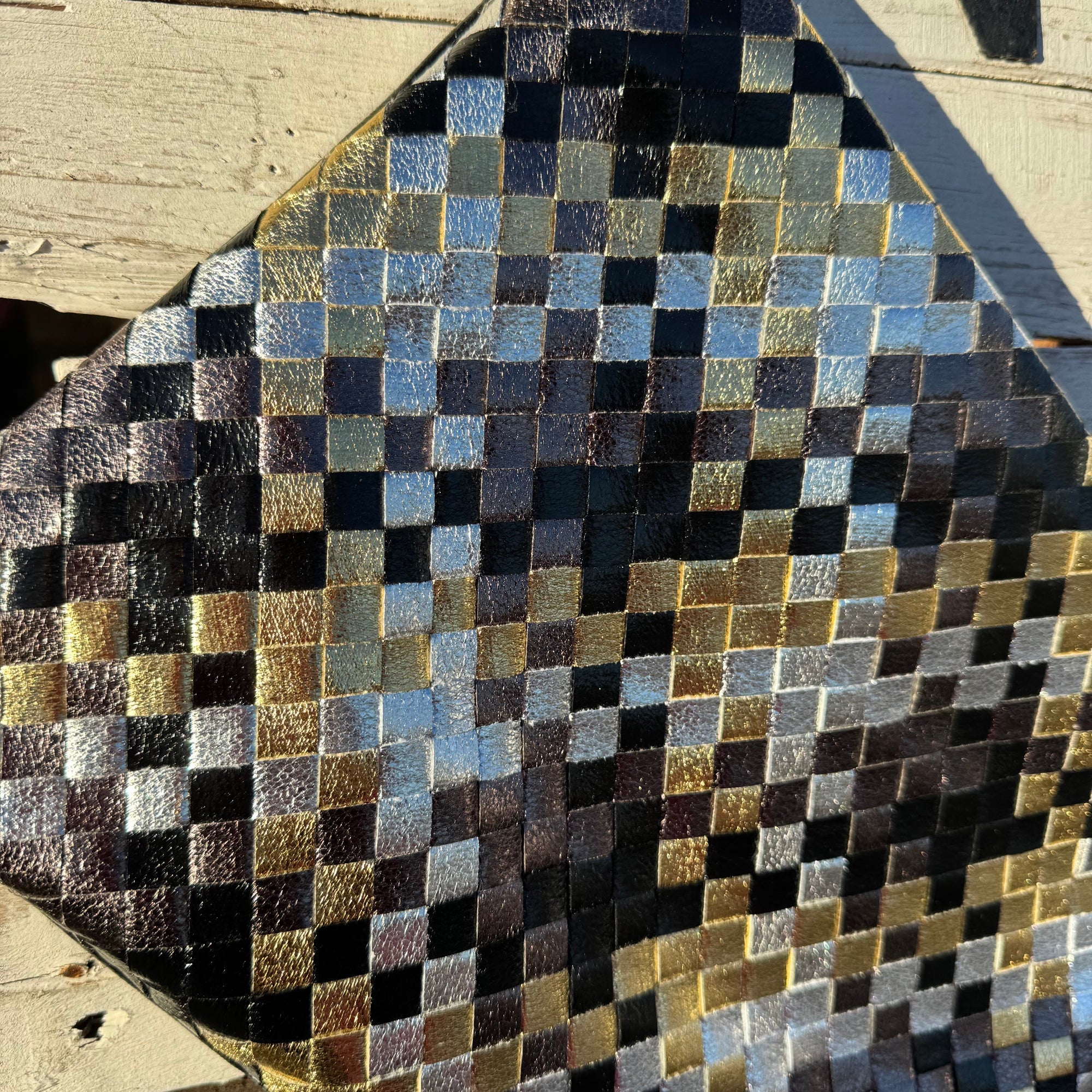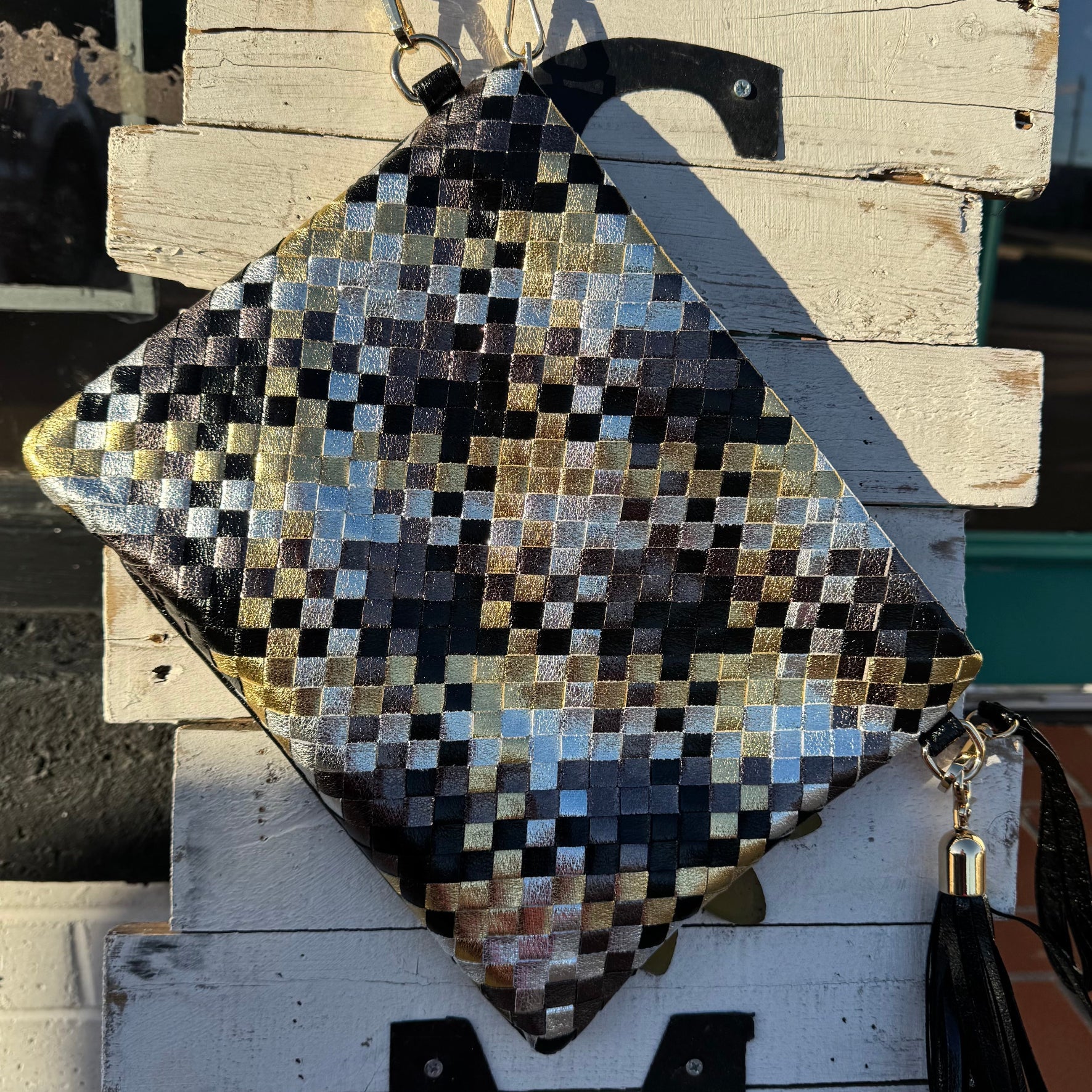 The metallic black, gold, and silver woven purse offers a stylish addition to any outfit. This elegant accessory perfectly combines sophistication with functionality. Crafted with meticulous attention to detail, the shimmering woven fabric catches light beautifully, making it ideal for both day and night events.
