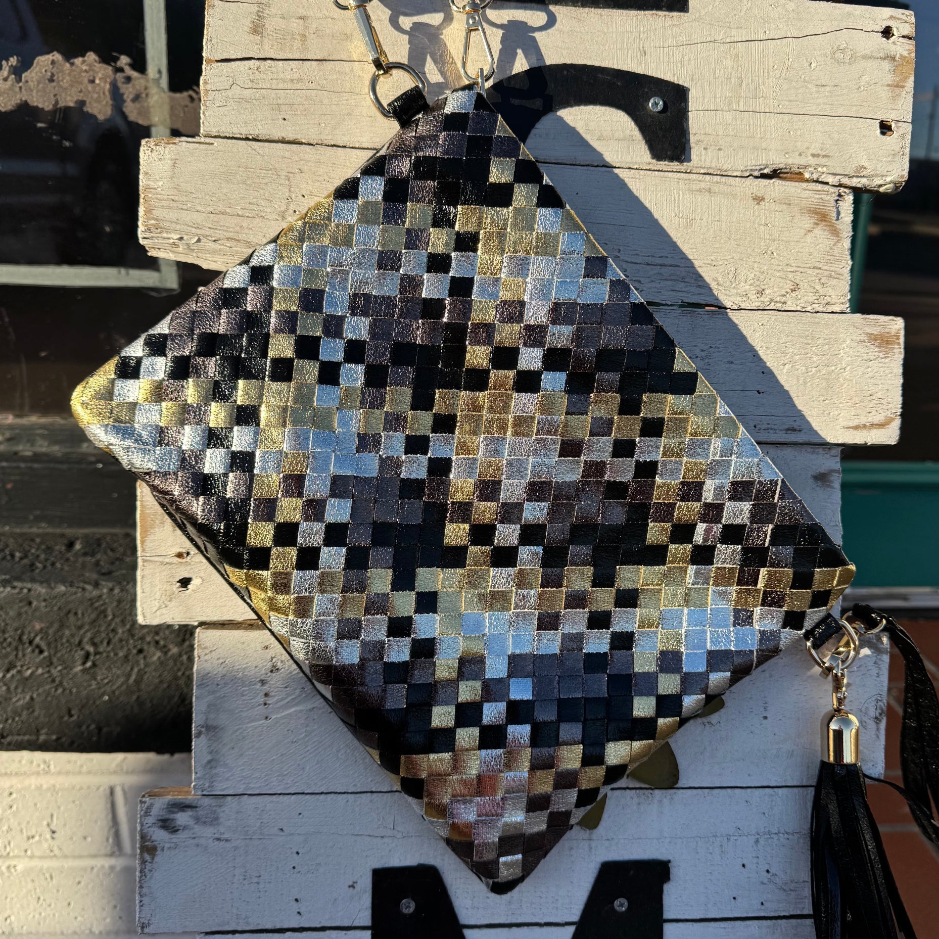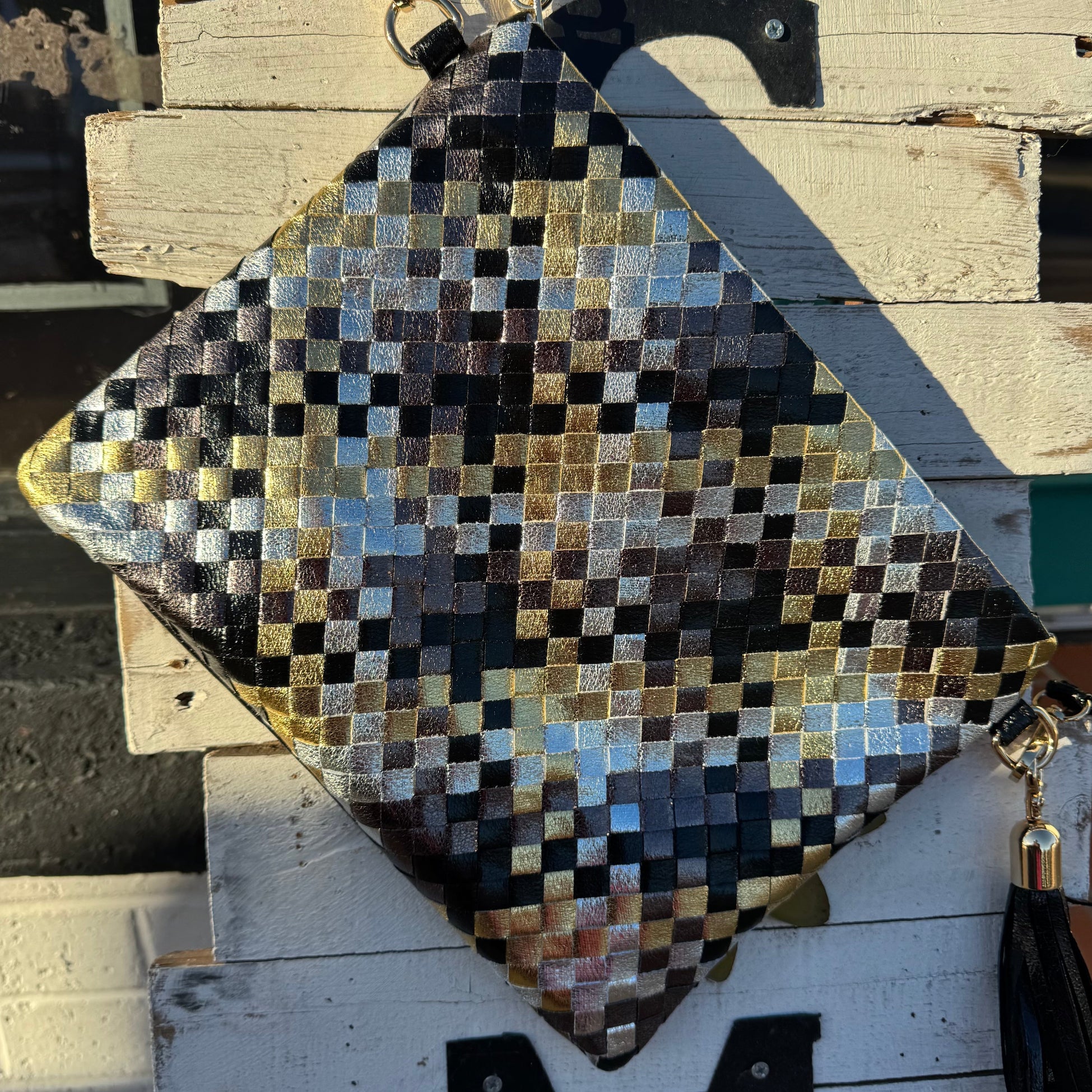 Metallic Black Gold, & Silver Woven Purse w/ Long & Wristlet Strap