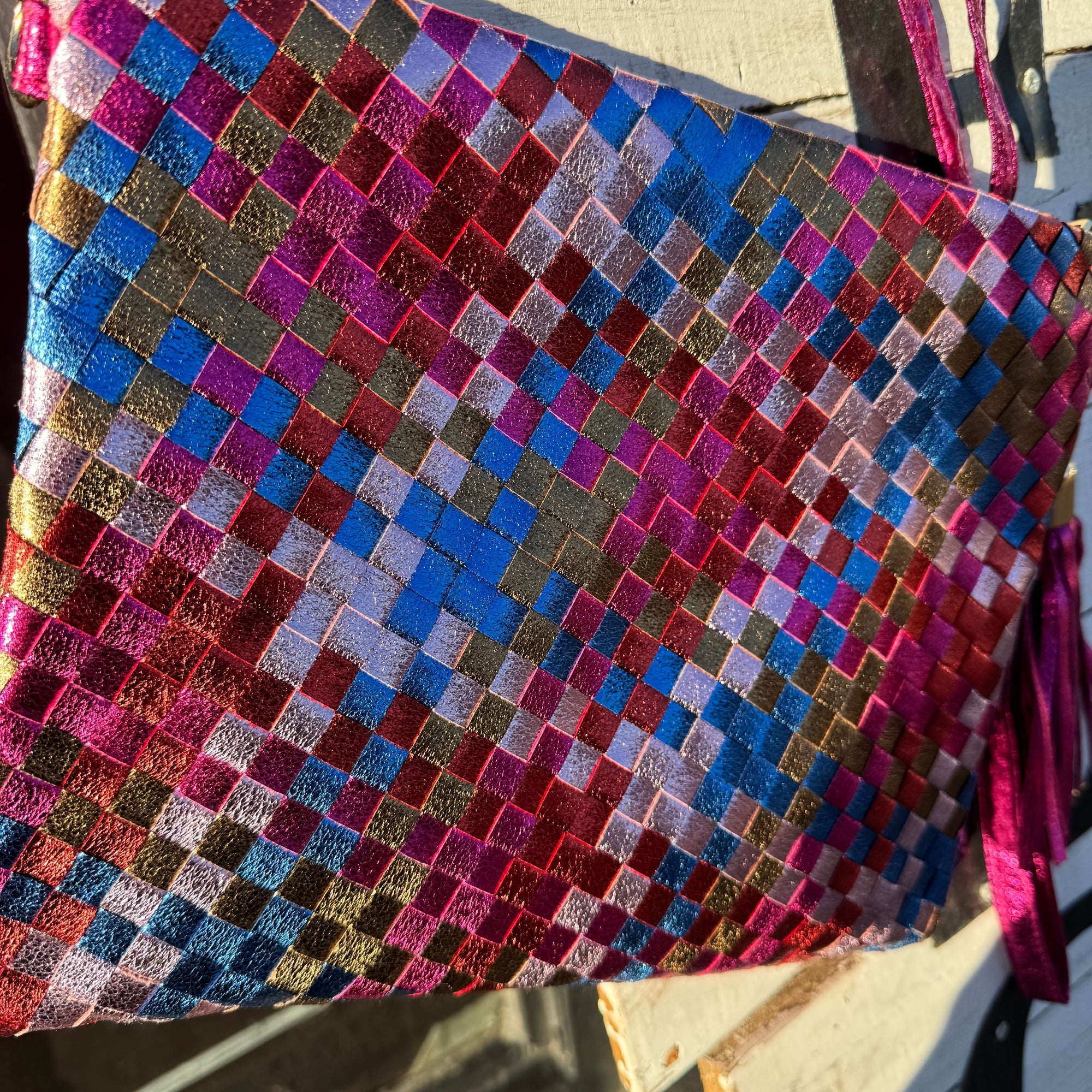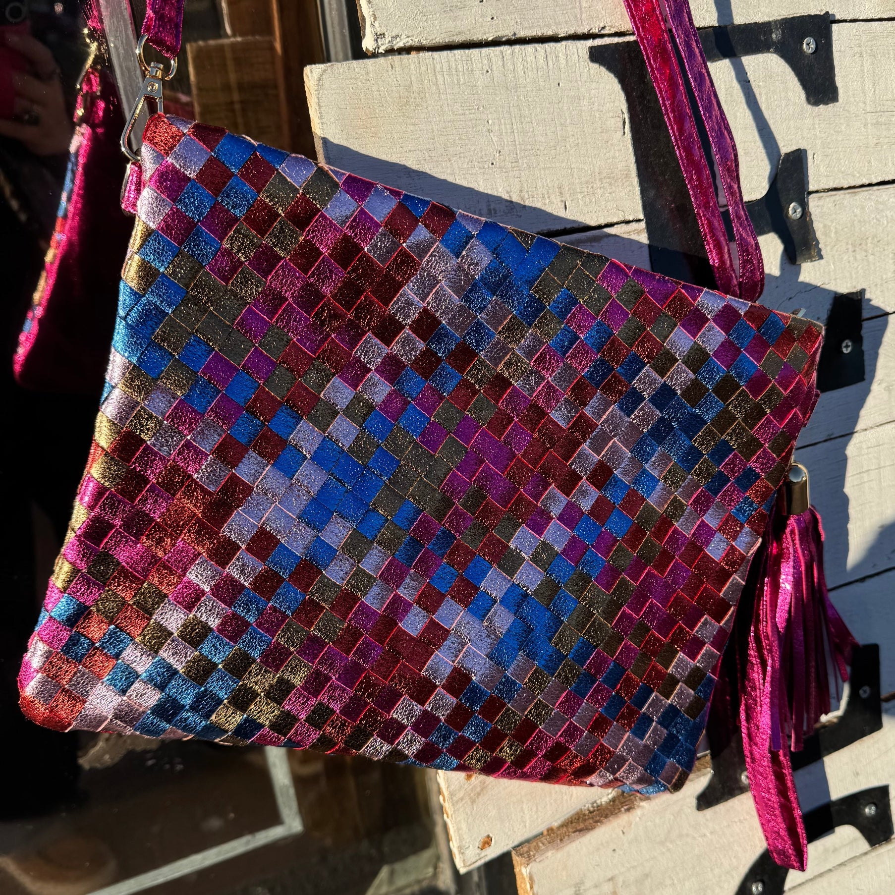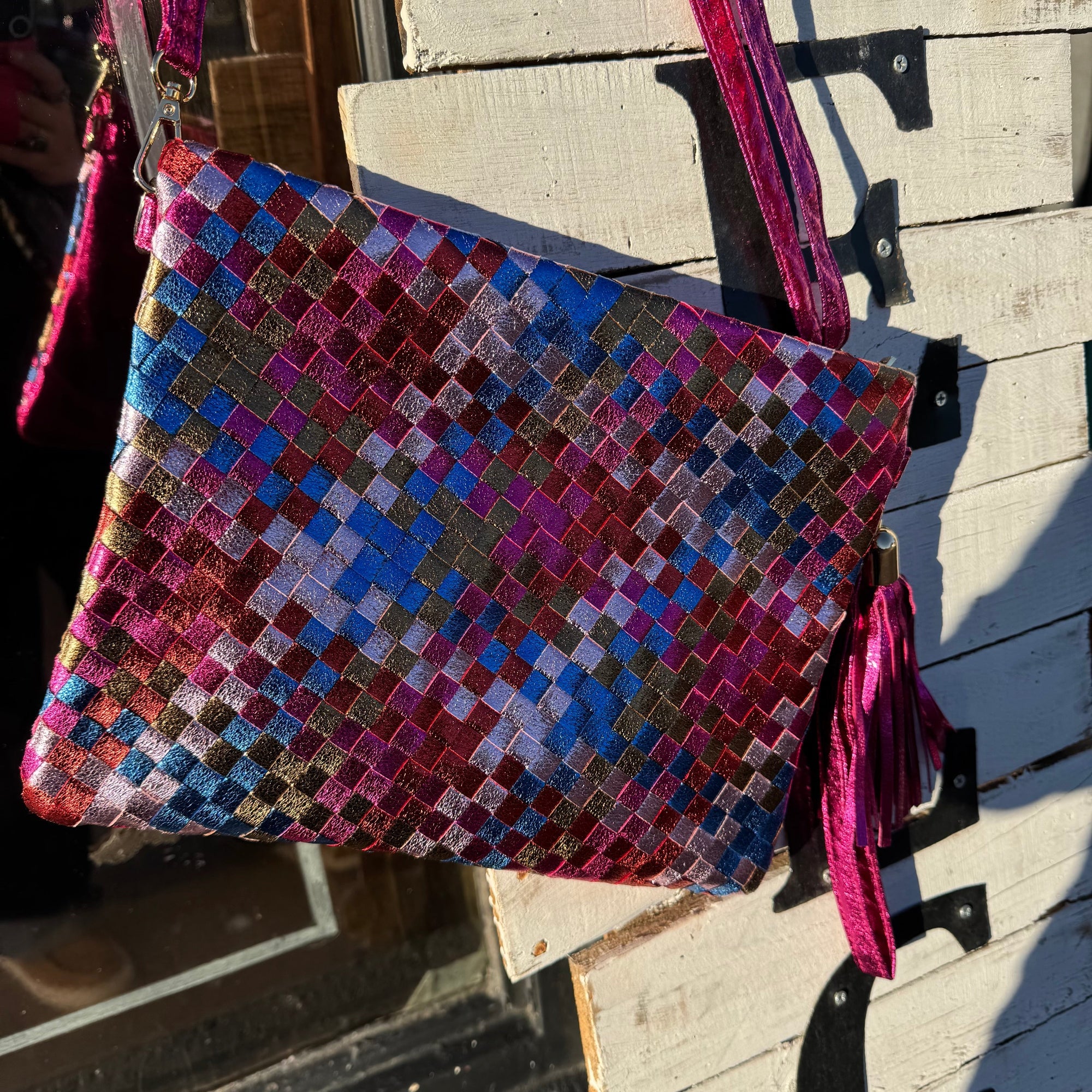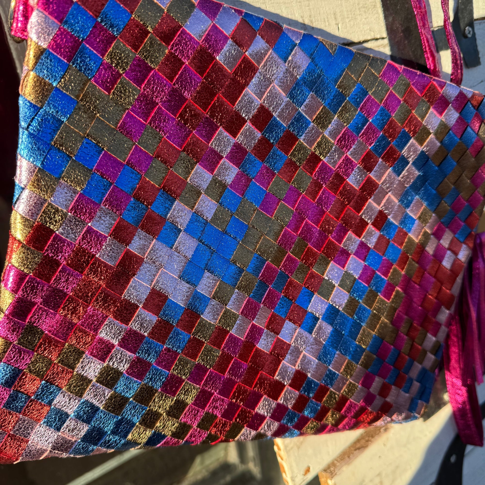 Metallic Hot Pink Gold, & Blue Woven Purse w/ Long & Wristlet Strap