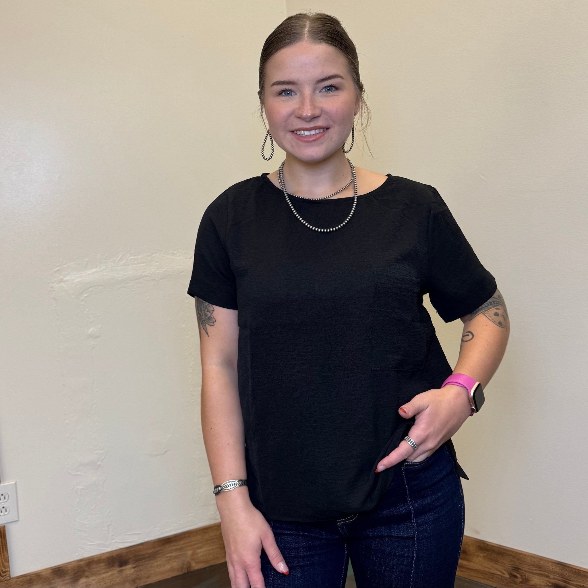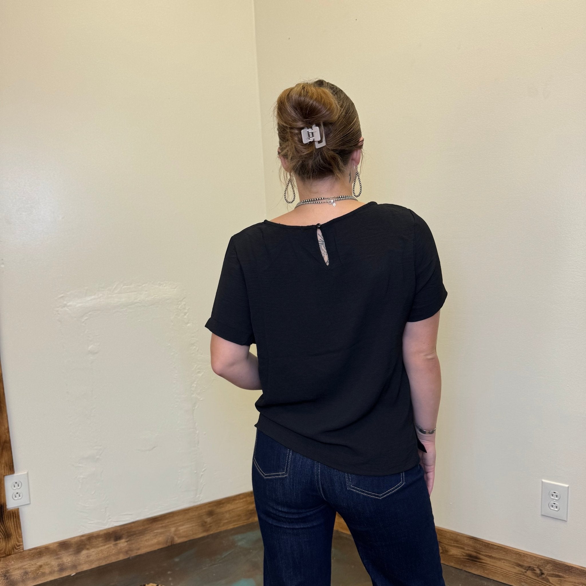 Black Round Neck Short Sleeve Blouse w/ Key Hole Button Back