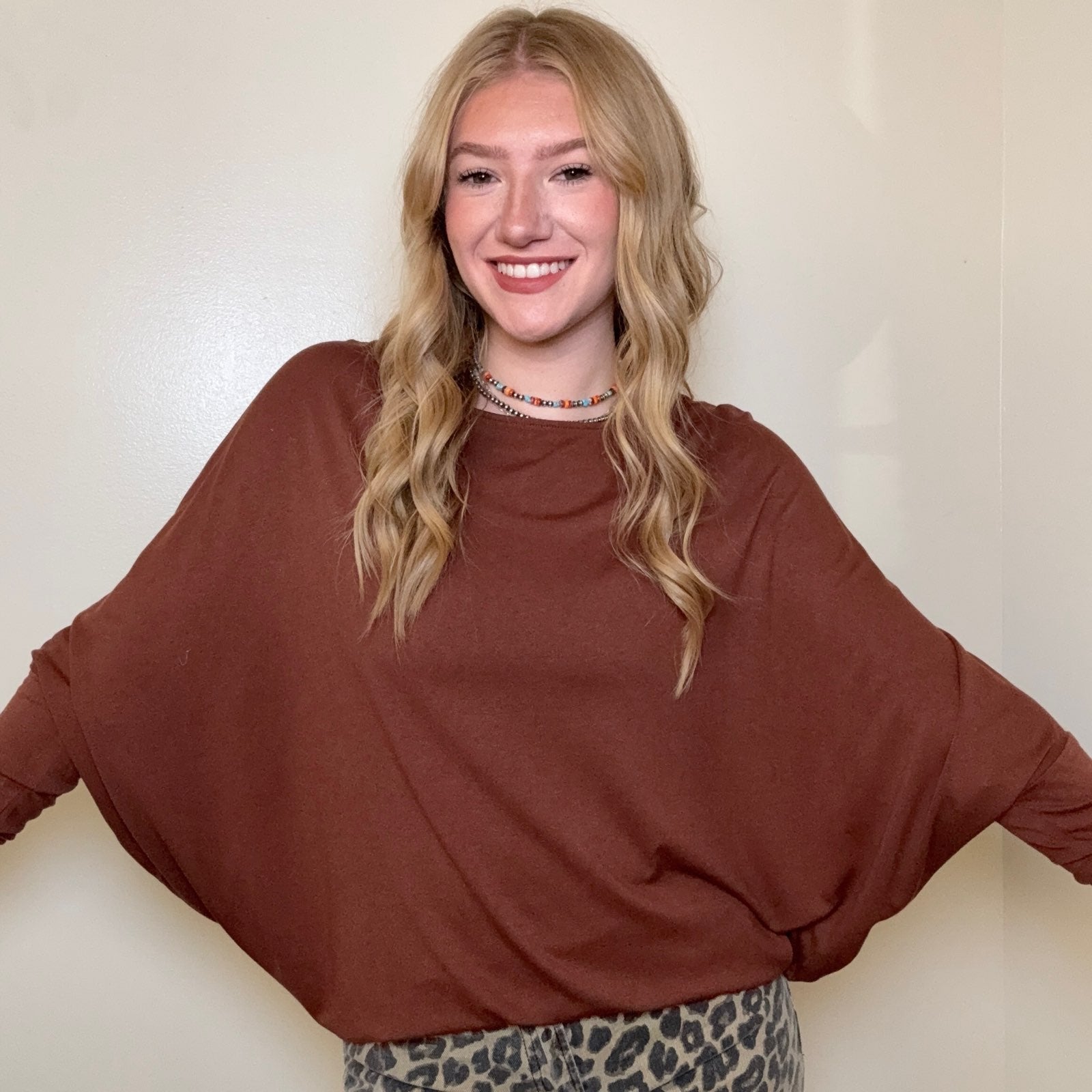 Shopping made easy: enjoy free shipping on orders over $100. Indulge in this versatile piece and explore other items that pair well with the Chestnut Brown Dolman Shirt to refresh your closet effortlessly. Whether dressing up or down, this shirt serves as the reliable foundation of countless outfits.