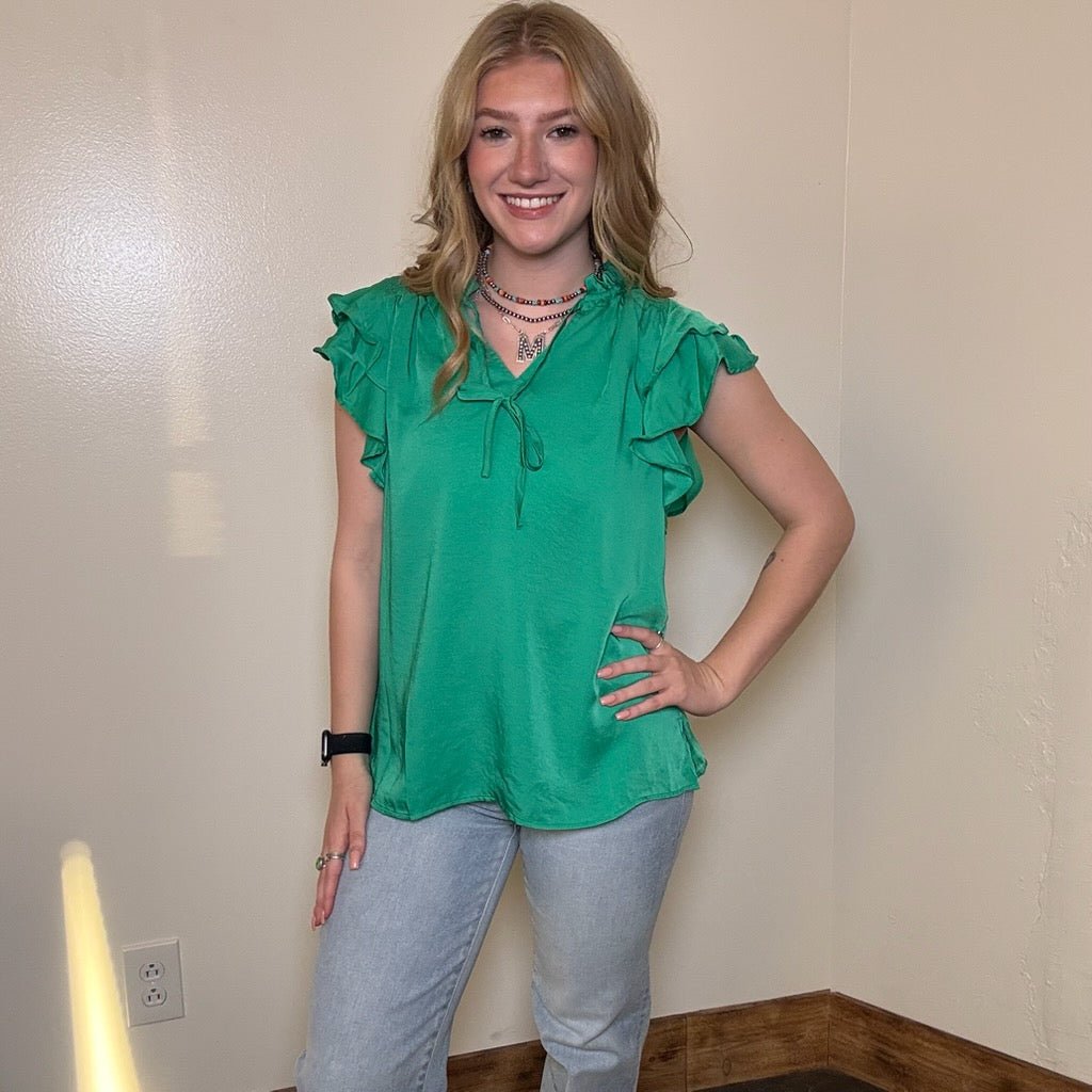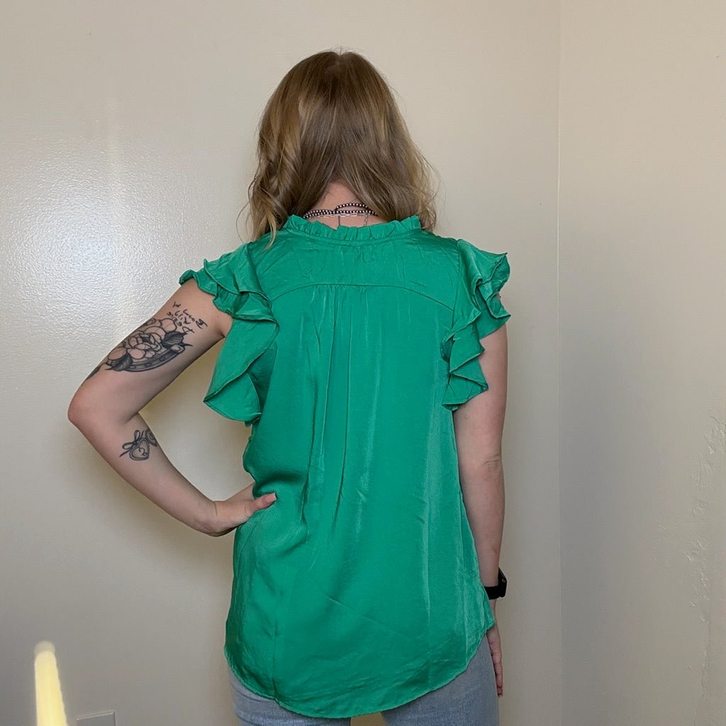 Flowy Green Silky Ruffle Short Sleeve Top