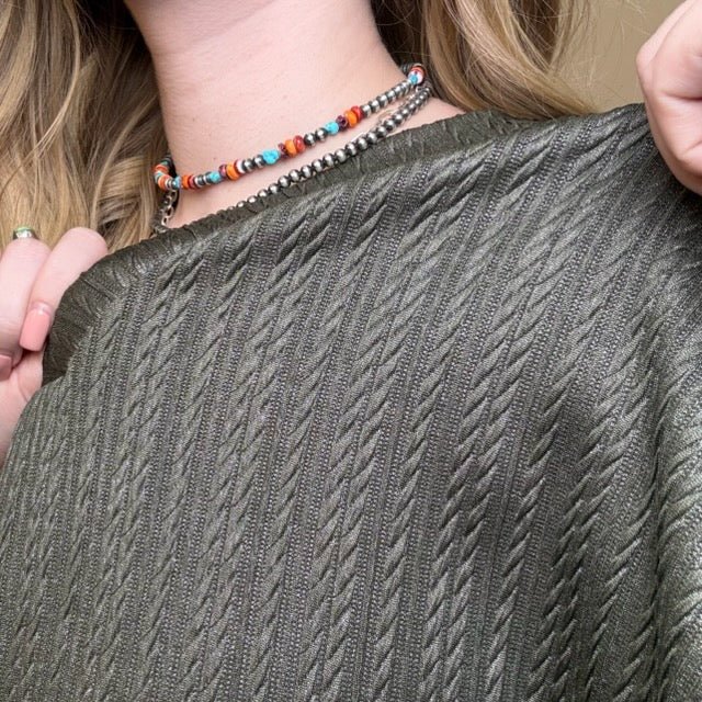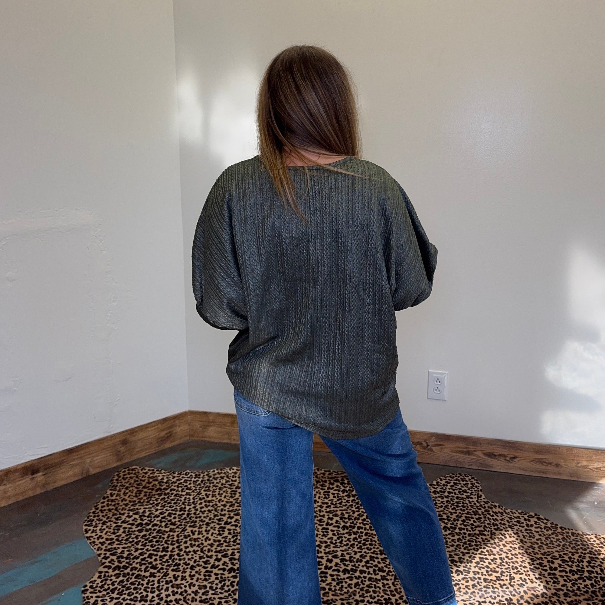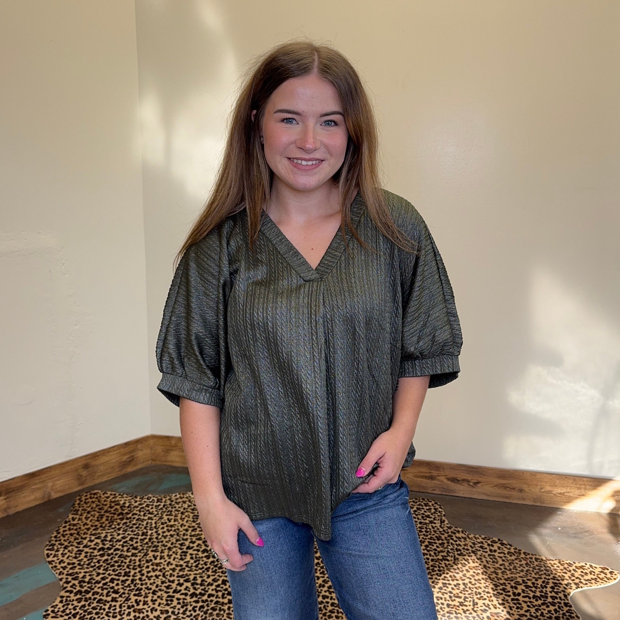 Olive w/ Foil V Neck Bubble Short Sleeve Top