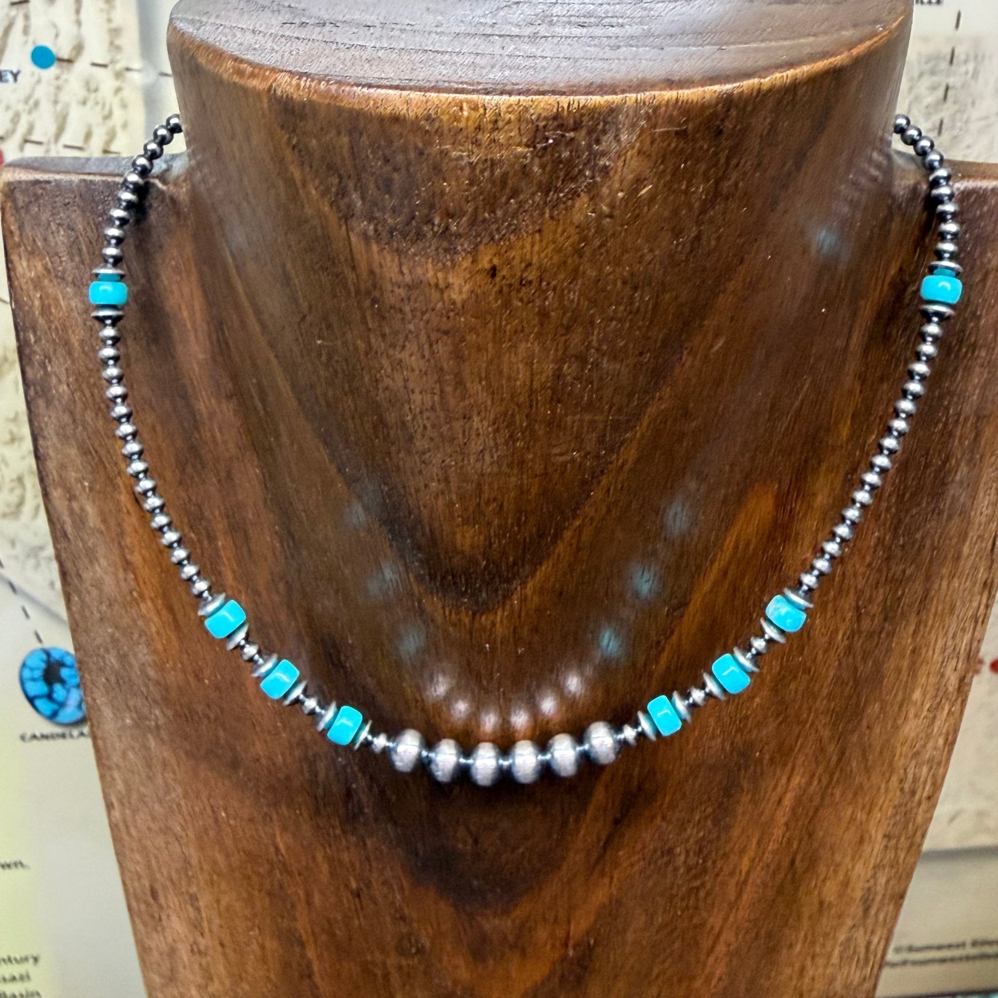 14 inch 3,6mm Navajo Pearls with Saucers and Turquoise Patterned Sterling Silver Necklace