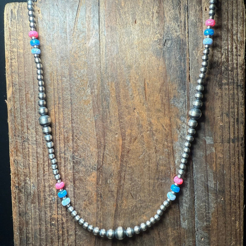 20 inch Patterned Navajo Pearl w/ Hot Pink, Blue, and White Opal Sterling Silver Necklace