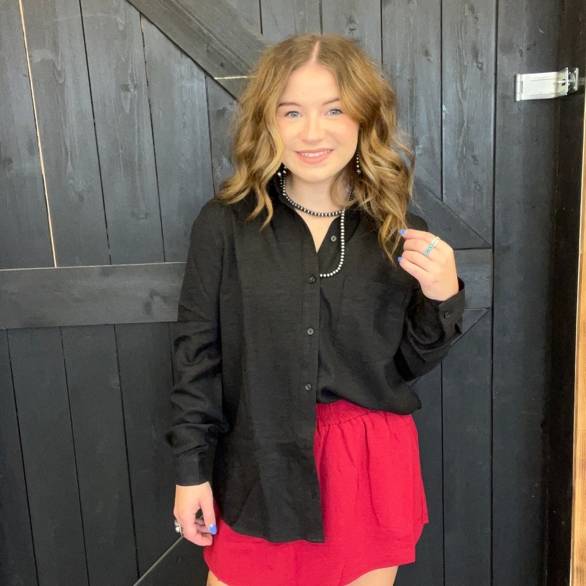 Black Button Down Long Sleeve with Front Pocket Top