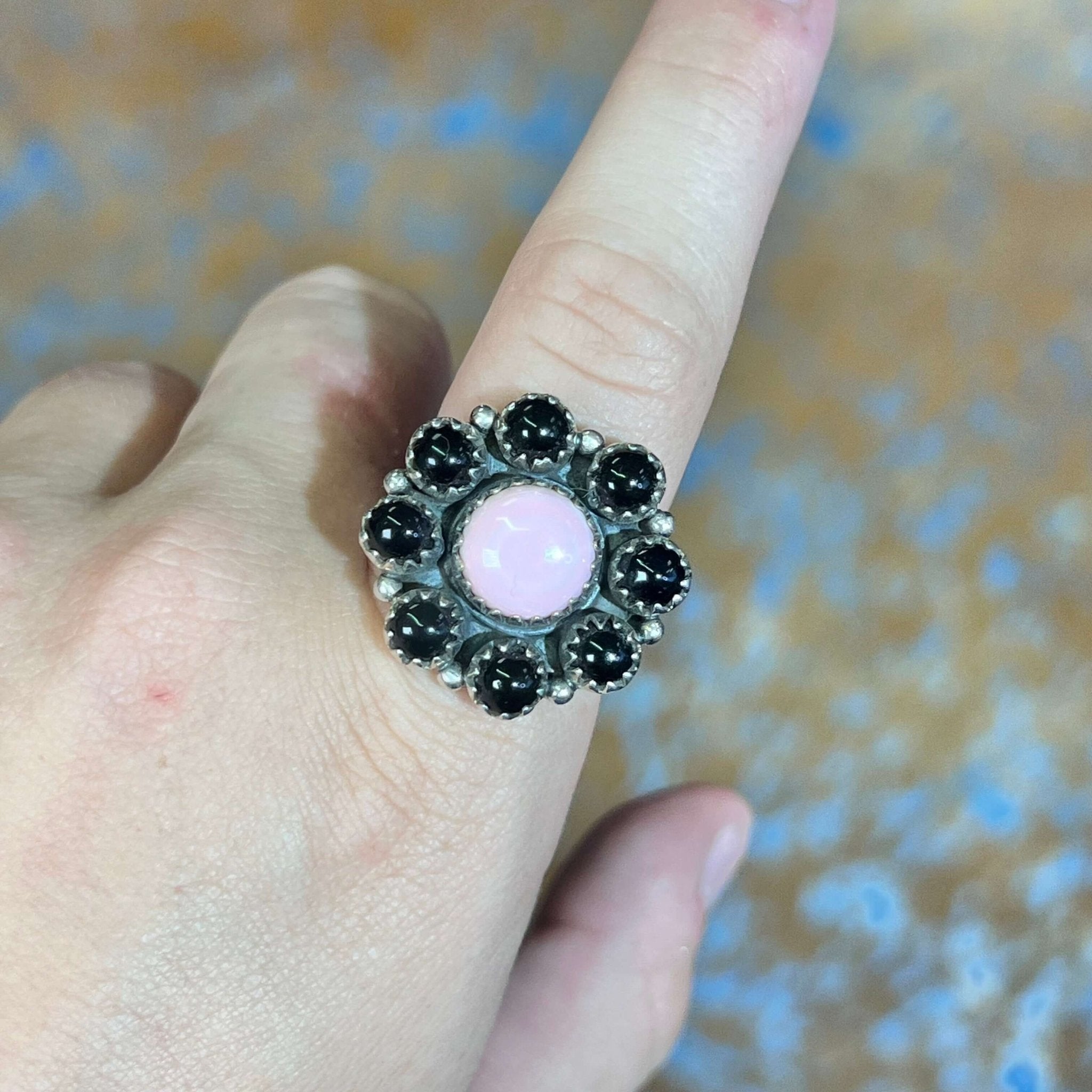 Black Onyx & Pink Conch Cluster Sterling Silver Ring size 7