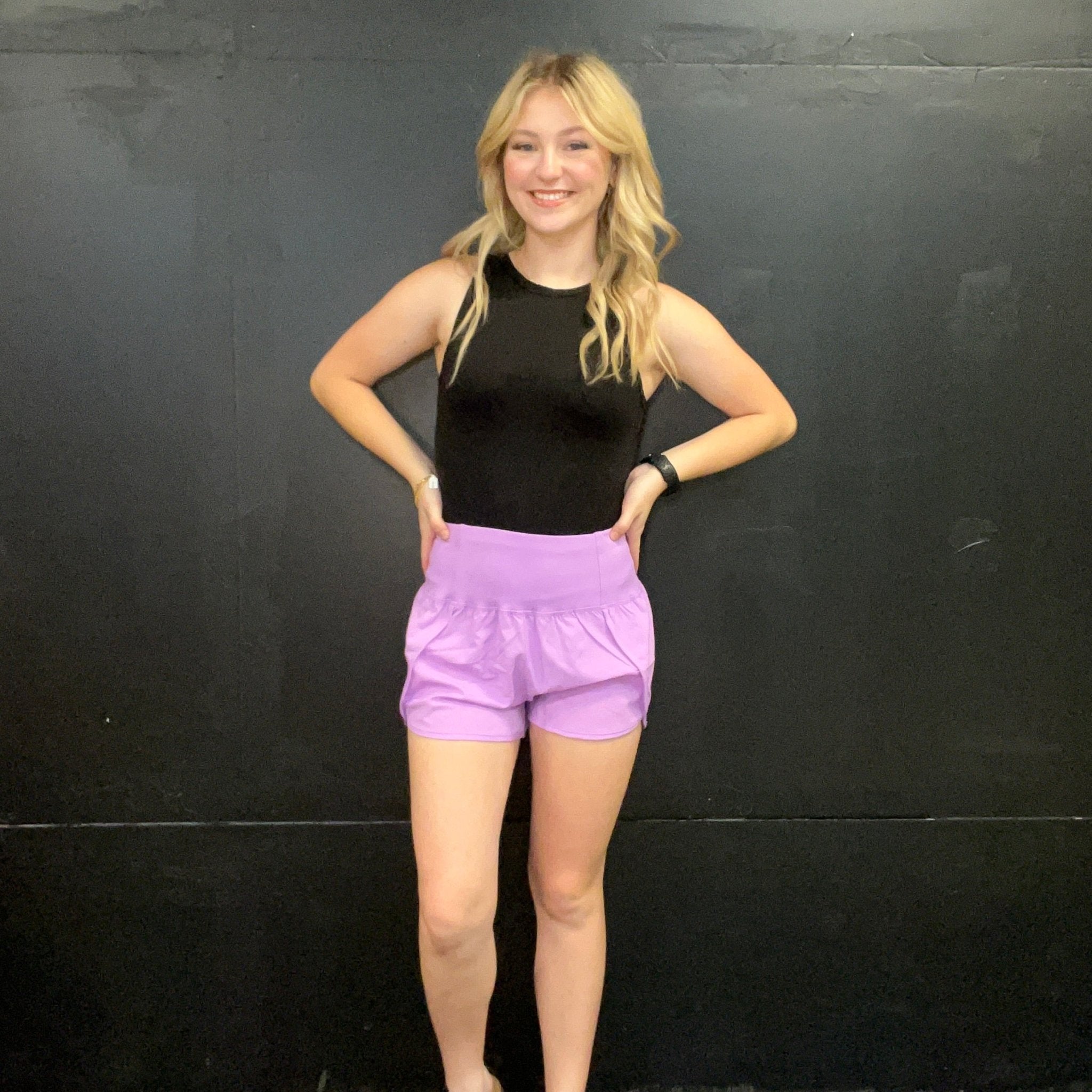90% Polyester 10% Spandex. Kaylee & Kylie are in a small Staci wears a XL