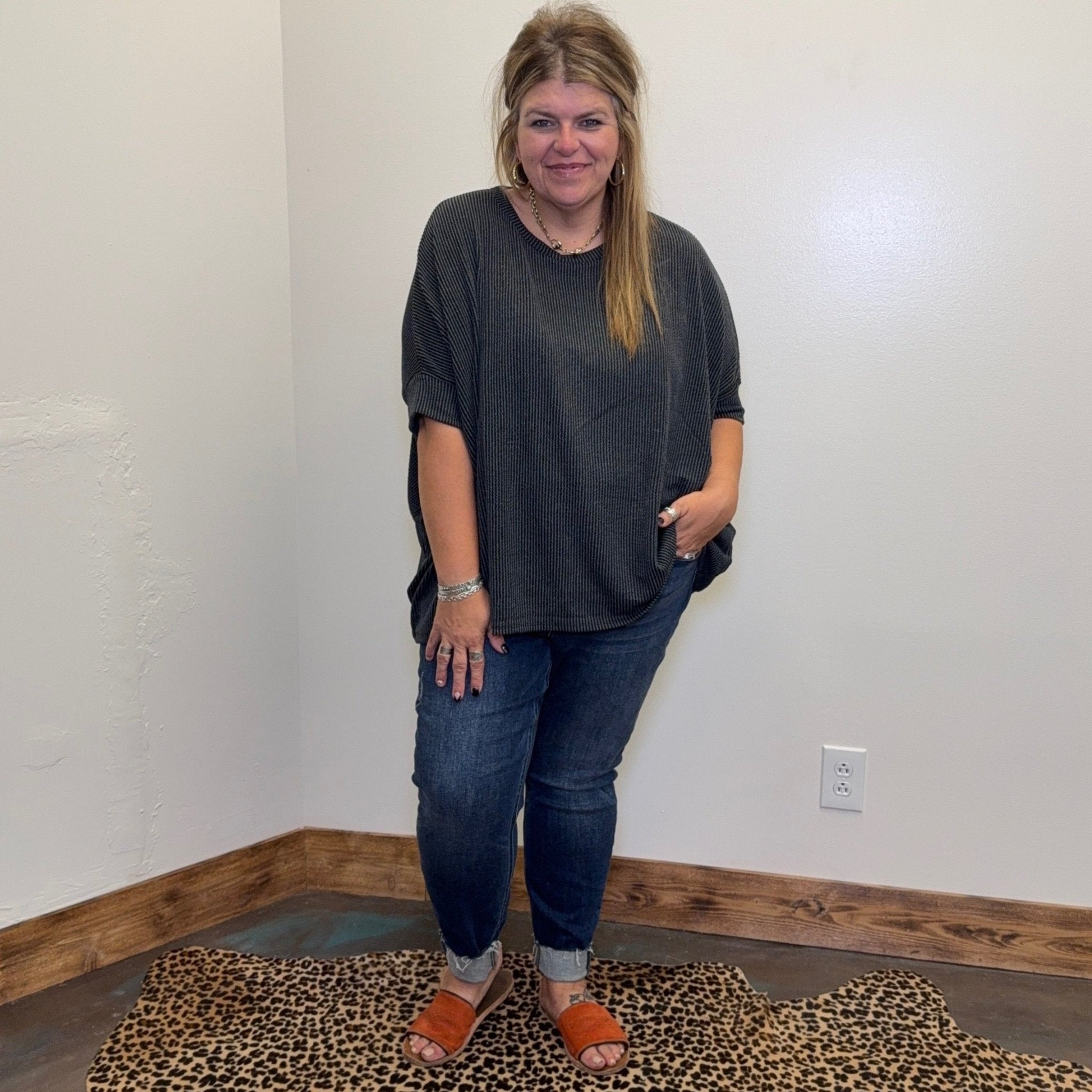 Kaylee is wearing the S/M size and Staci is wearing the 1XL/2XL size, showcasing the versatility of this Charcoal Ribbed Dolman Top. Whether you prefer a more fitted or relaxed look, there's a size for everyone. Treat yourself to this must-have top and elevate your everyday style effortlessly.