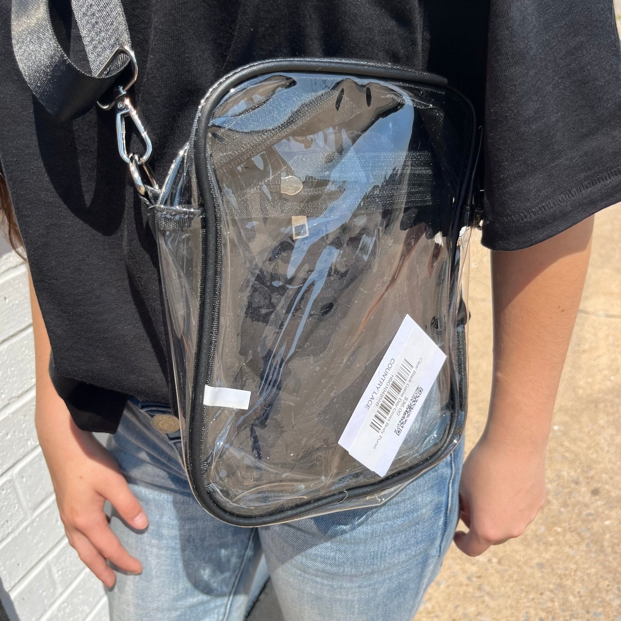 The Clear Black Game Day Cross Body Purse is the ultimate accessory for any sports fan. This stylish and functional purse features a sleek, clear black design that will compliment any game day outfit. The adjustable strap allows you to wear it comfortably across your body, keeping your hands free to cheer on your favorite team.