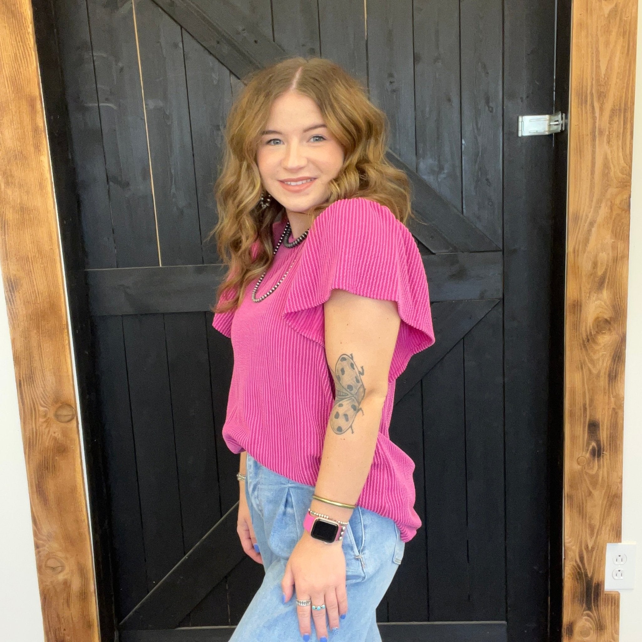 Dark Fuchsia Ribbed Flutter Sleeve Shirt