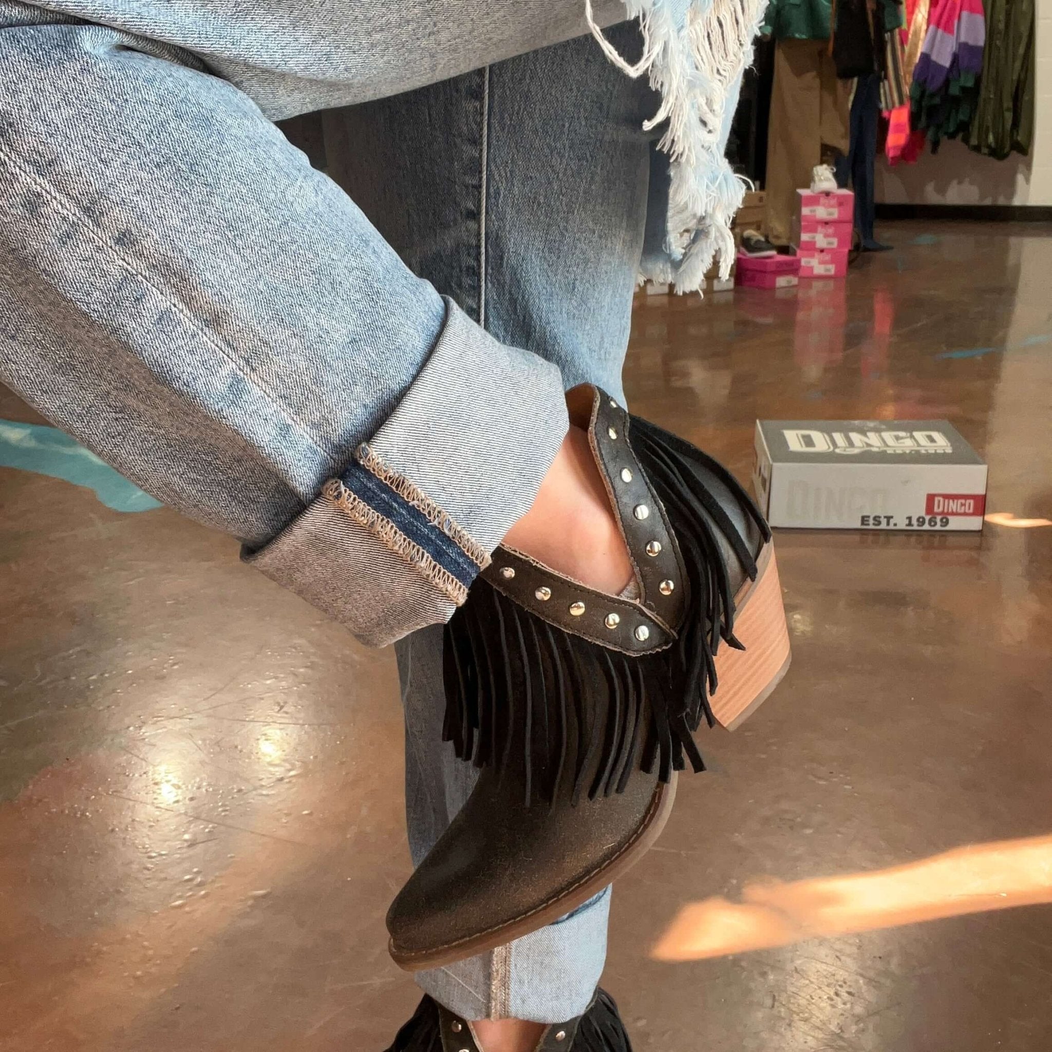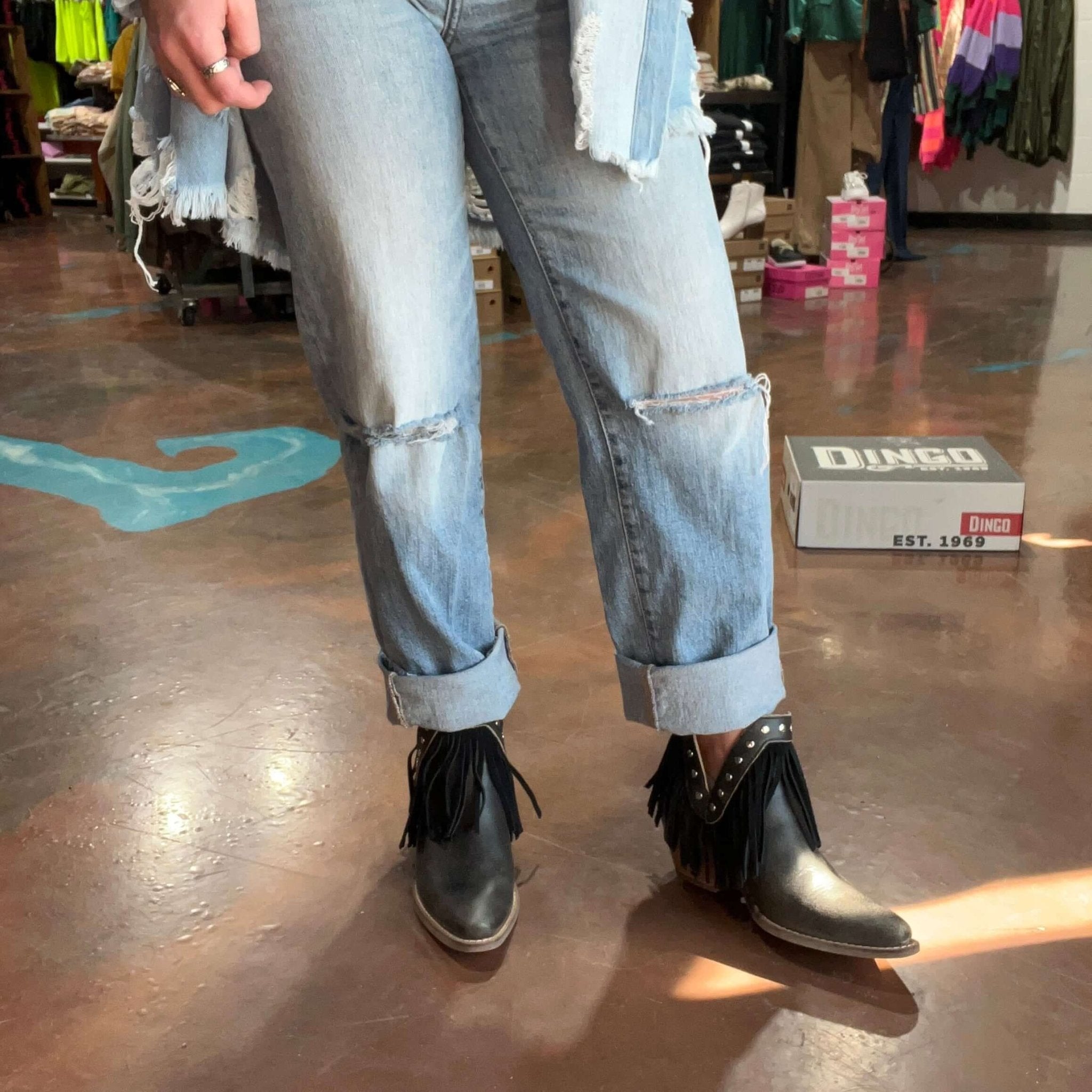 With its fringey and stud details, the Fine N' Dandy bootie from Dingo1969 is all about the embodying the alternative, free-spirited energy. With its variety of colors, the Fine N' Dandy with its 2-1/2 inch heel has an option for anyone looking to make their individuality a statement.
