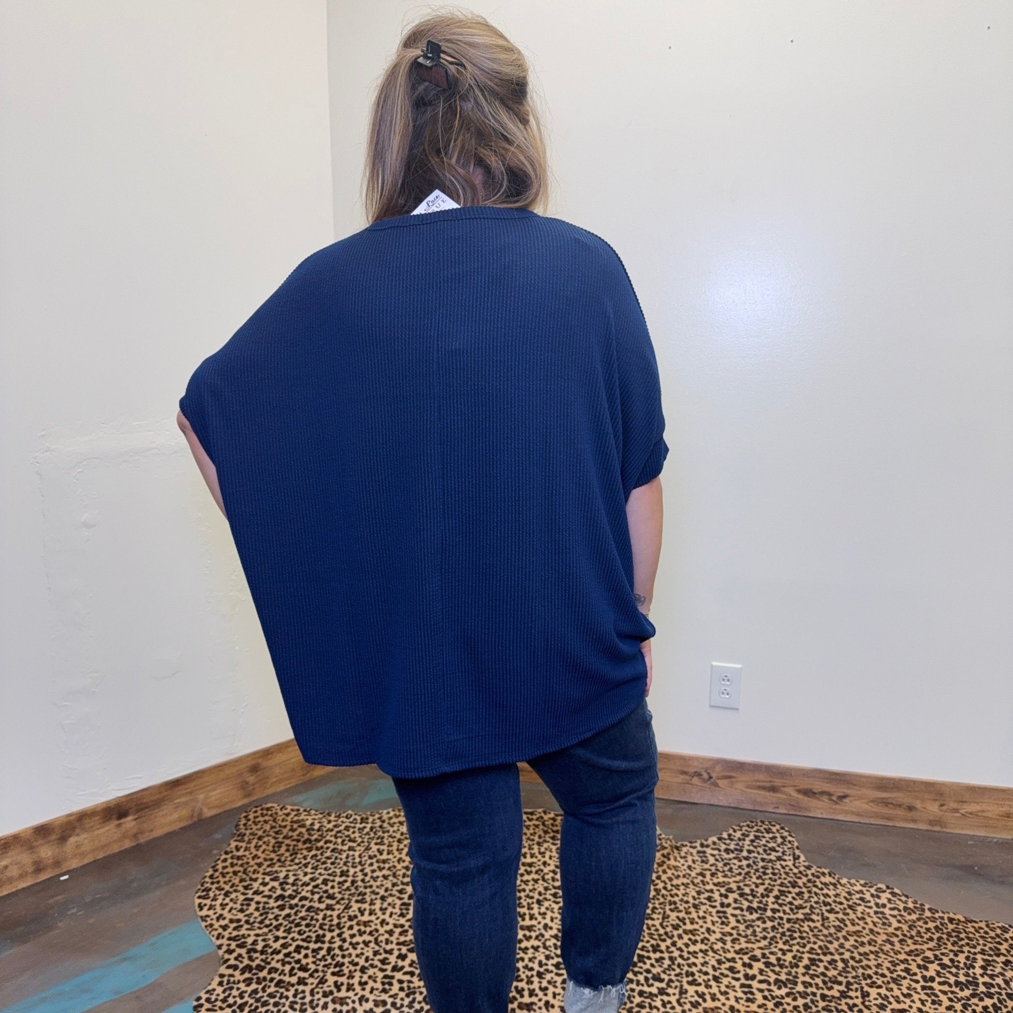 Enjoy free shipping on orders over $100 and discover the perfect Navy Ribbed Dolman Shortsleeve Top for your personal style. Add this versatile piece to your collection today and experience the ultimate blend of fashion and comfort. Don't miss out on this must-have staple for your wardrobe!