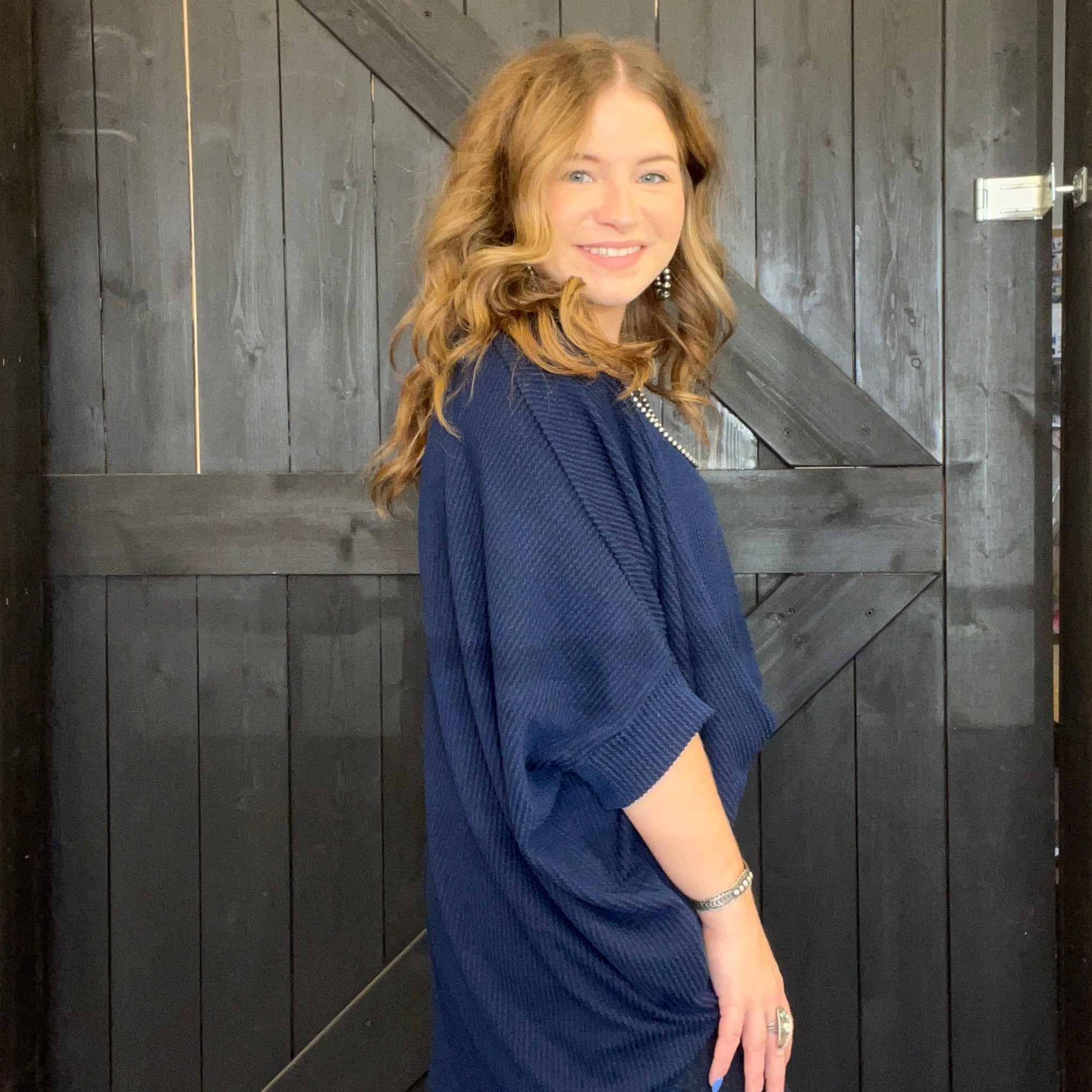 This top is a timeless addition to your wardrobe with its classic navy color. The versatile hue makes it easy to mix and match with other pieces in your closet. Whether you're running errands or meeting friends for brunch, this top will have you looking effortlessly chic. Kaylee is wearing the s/m size, while Staci prefers the xl/2xl for a more oversized fit.