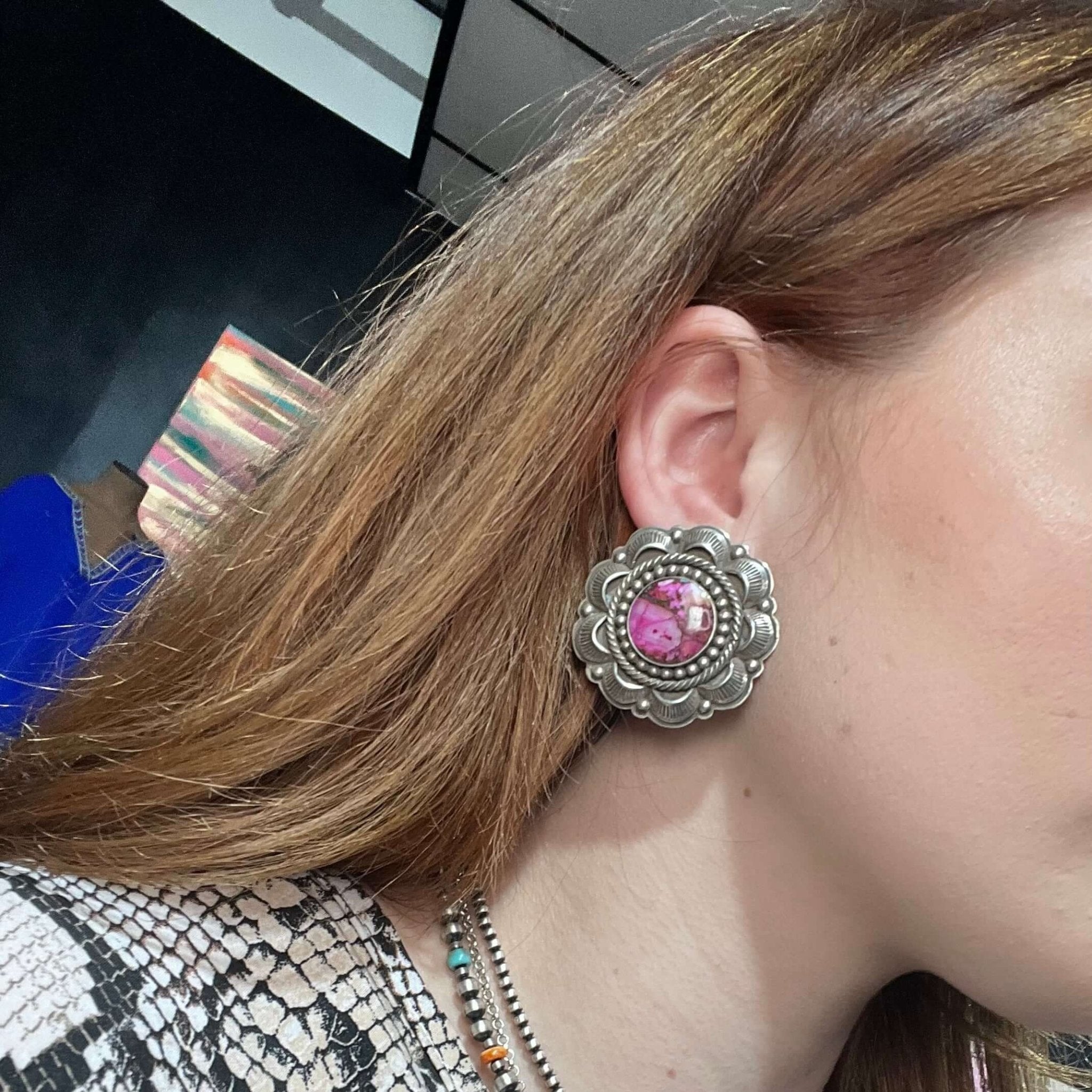 Pink Dahlia Fancy Round Post Sterling Silver Earring