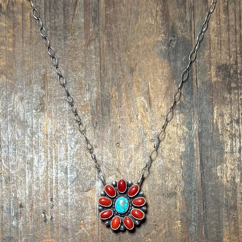 Red Coral Cluster with a Sonoran Gold Center Sterling Silver Necklace