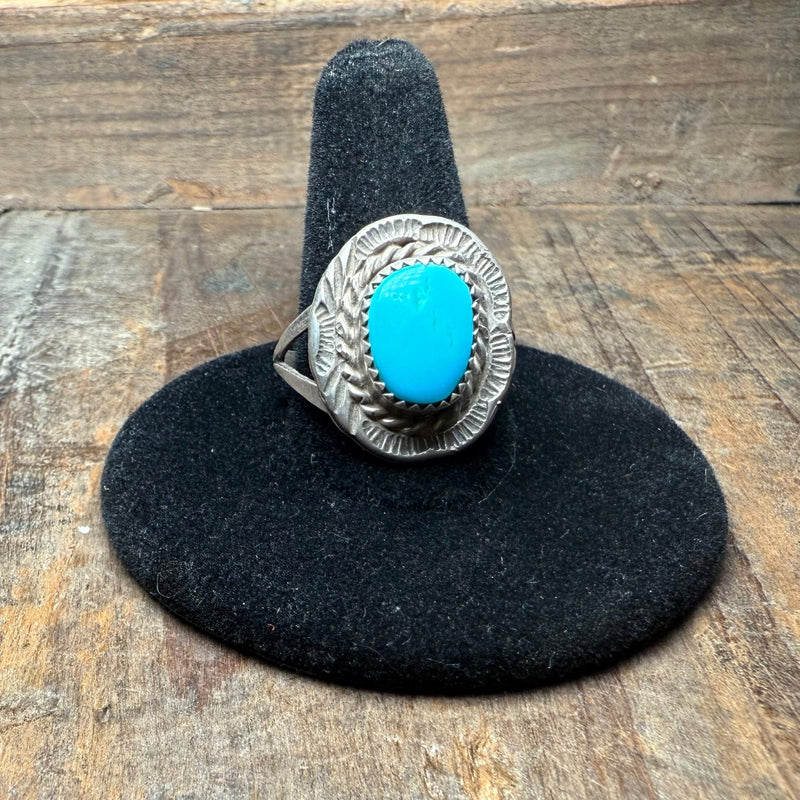 Single Turquoise Stone Sterling Silver Ring W/ Flower Detail size 8.5