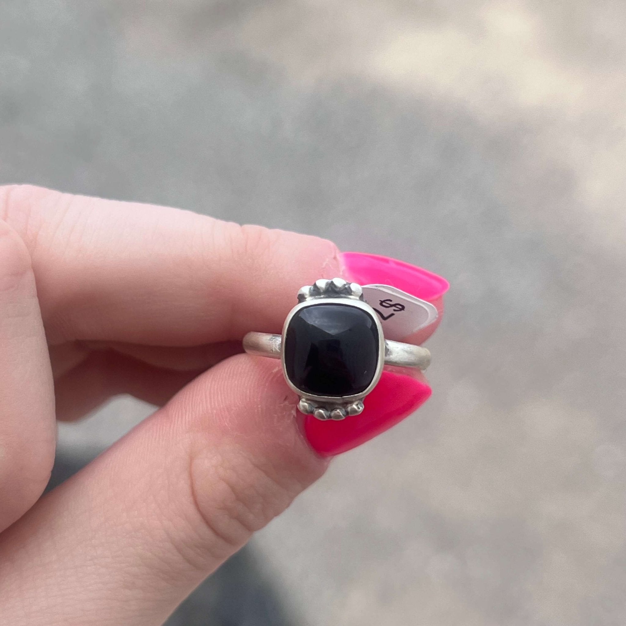 Square Black Onyx with Ball Detail Sterling Silver Ring