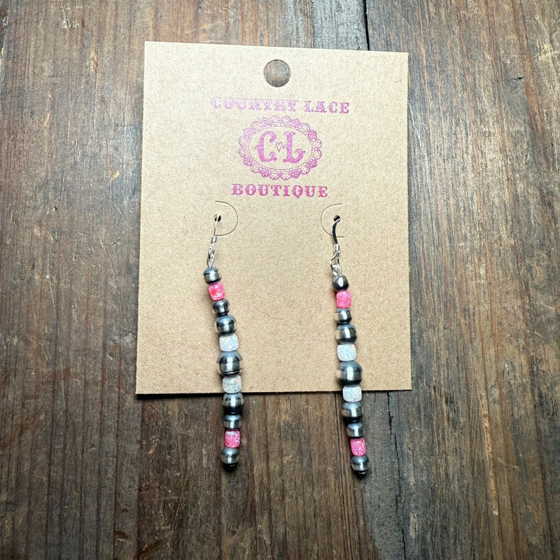 Straight Patterned Navajo Pearl with Hot Pink & White Opal French Hook Sterling Silver Earring