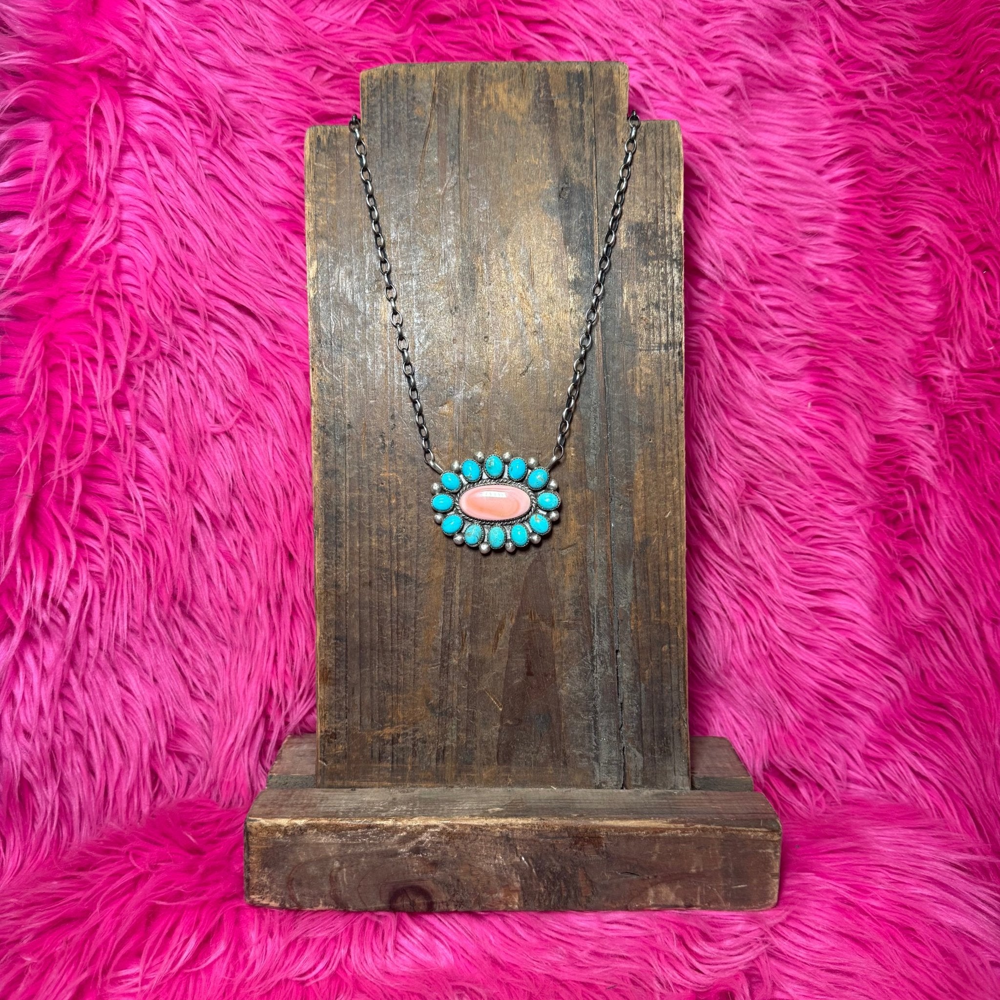 Authentic Turquoise & Pink Conch Cluster Sterling Silver Necklace